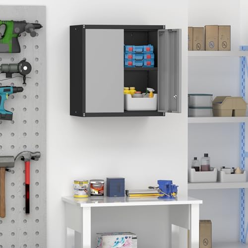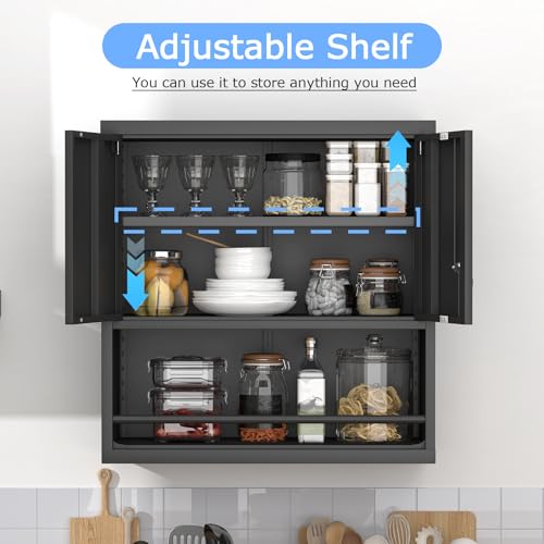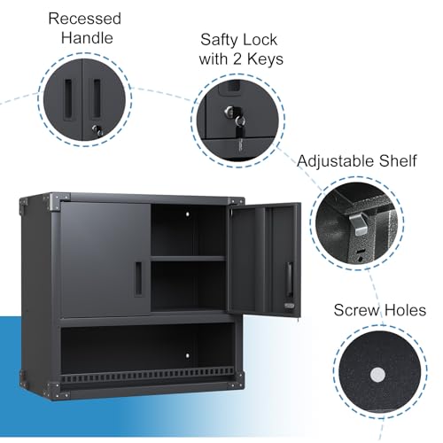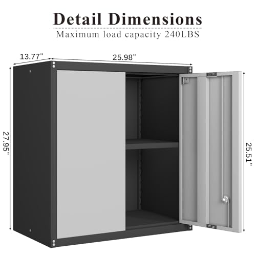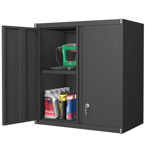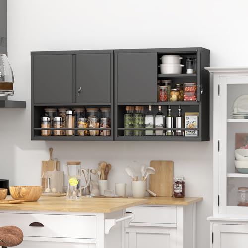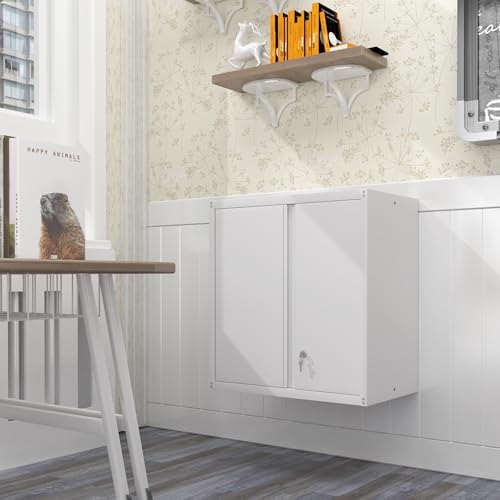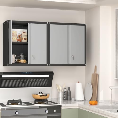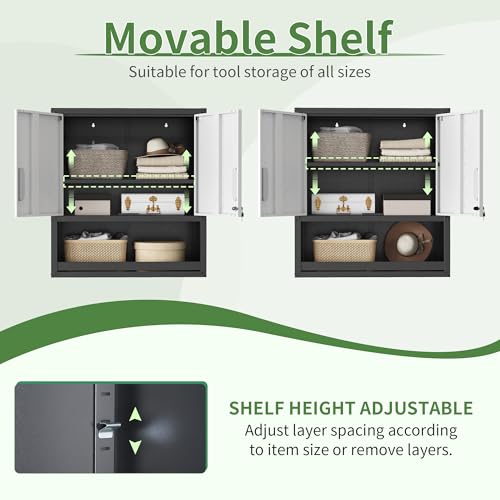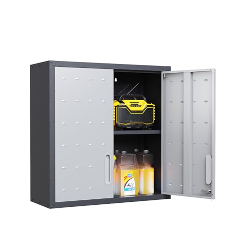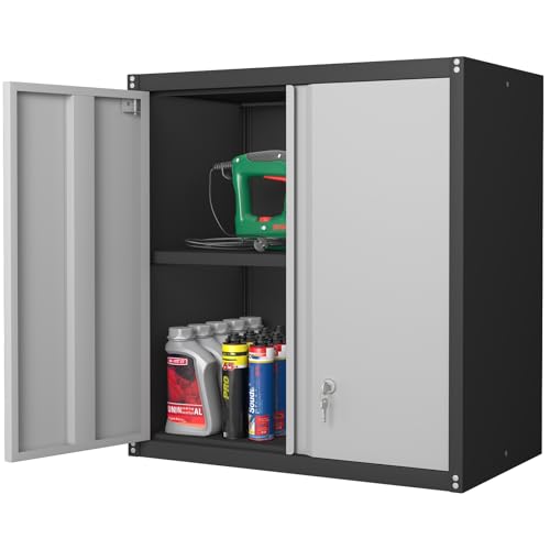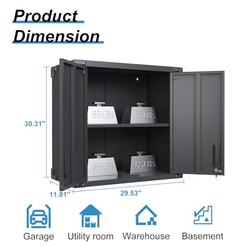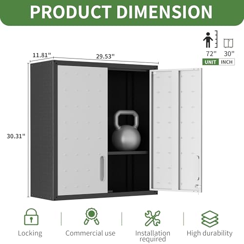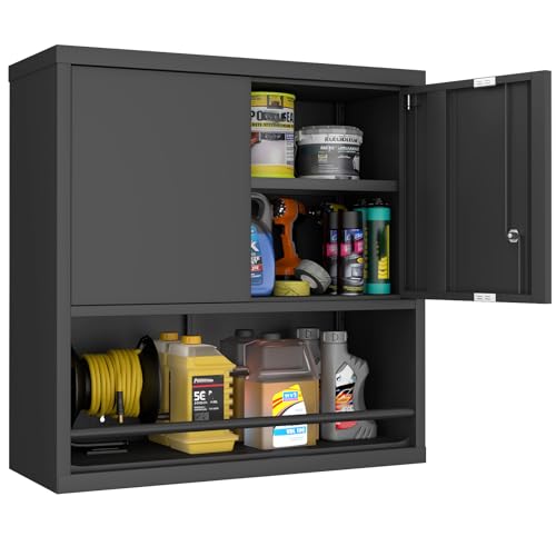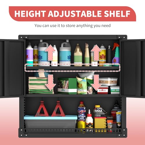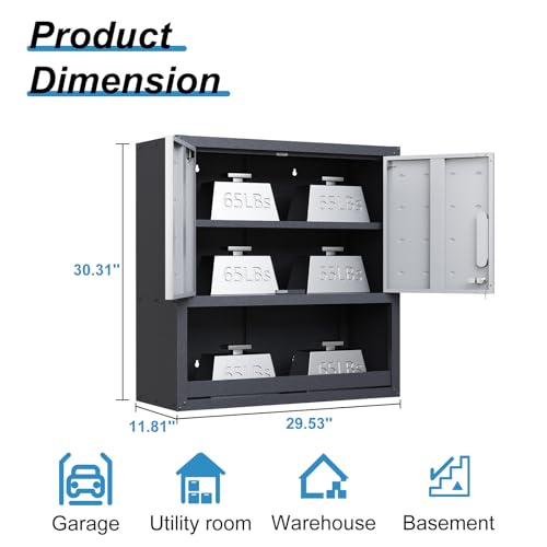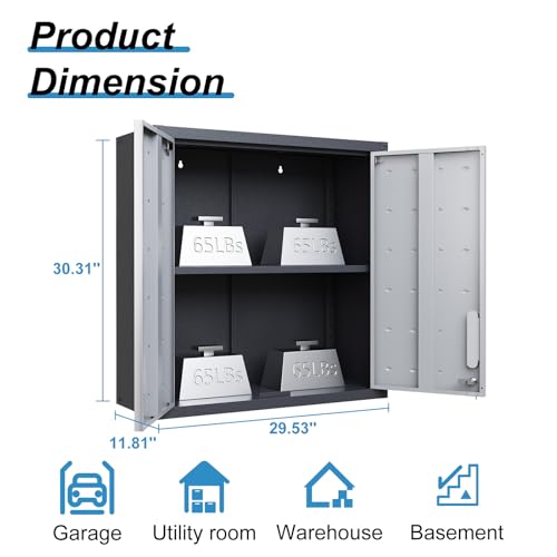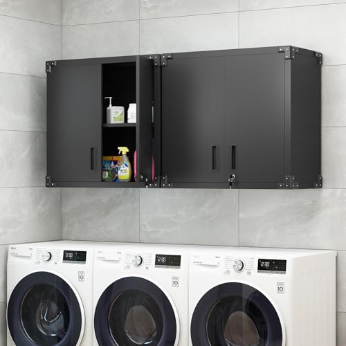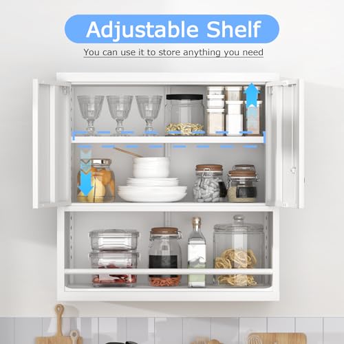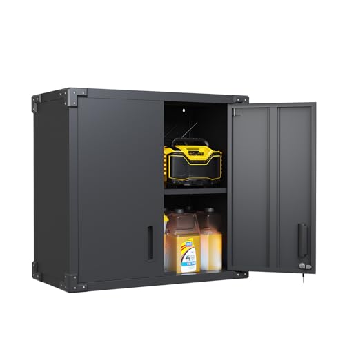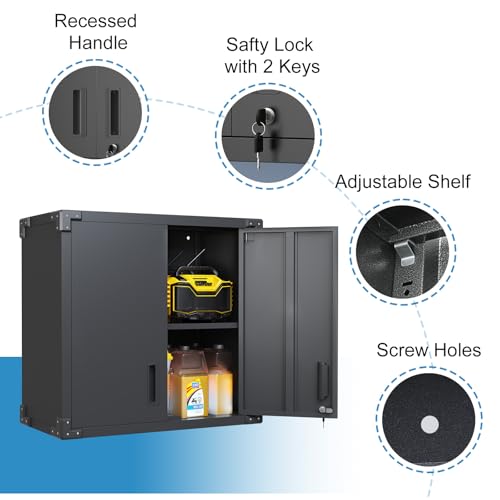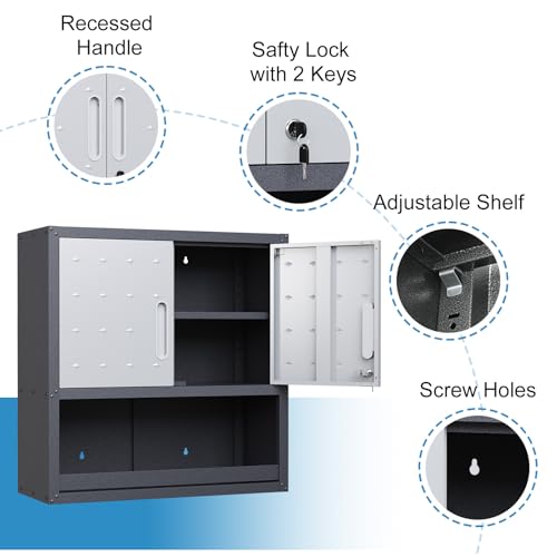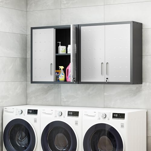 Garage Storage Cabinet Wall Cabinet with 2 Doors,Lockable Tool Cabinets Wall Mounted with Adjustale Shelves,Heavy Duty Steel Hanging Cabinets for Warehouse Kitchen Laundry,Assembly Required