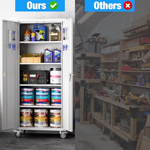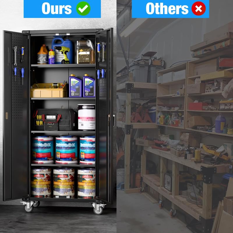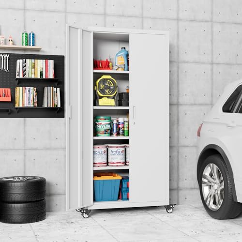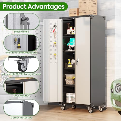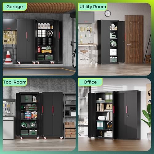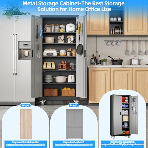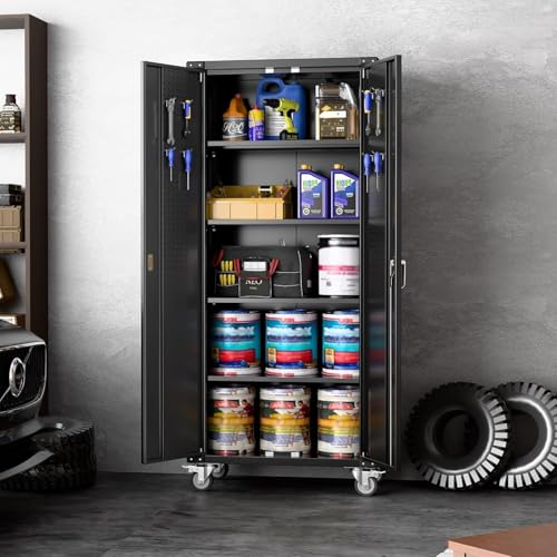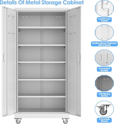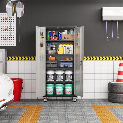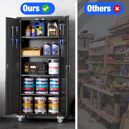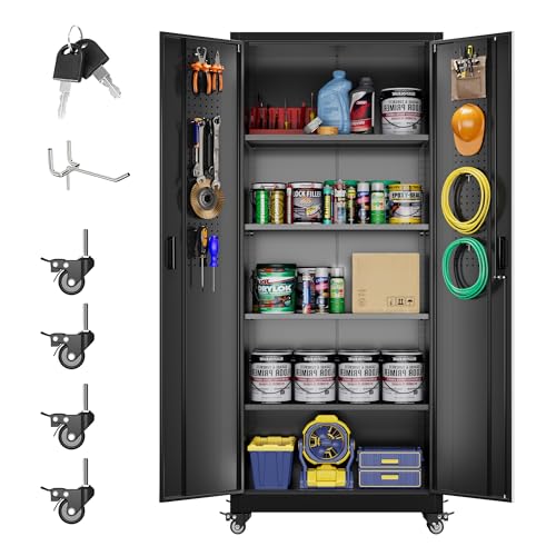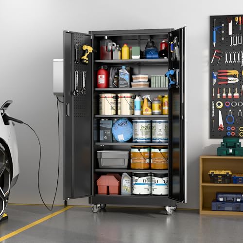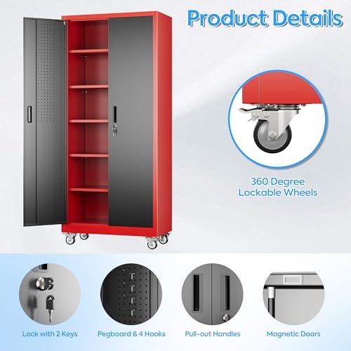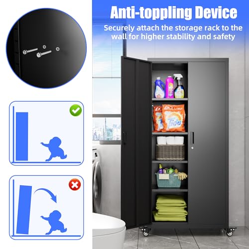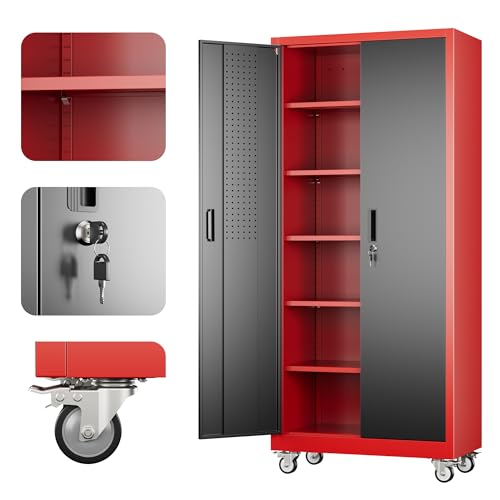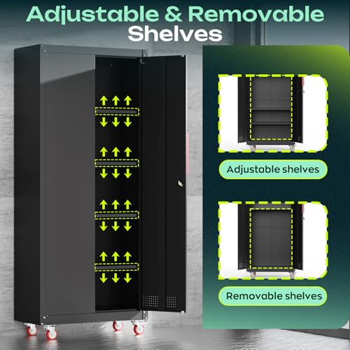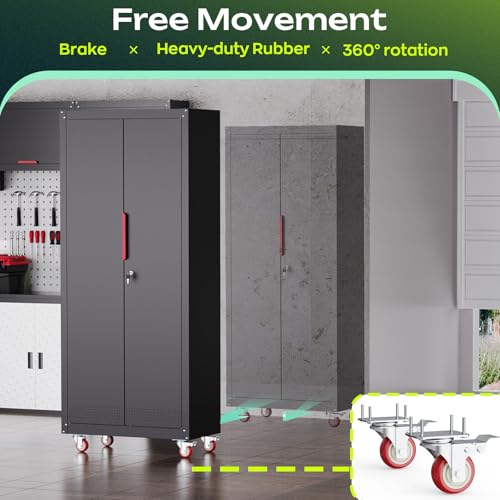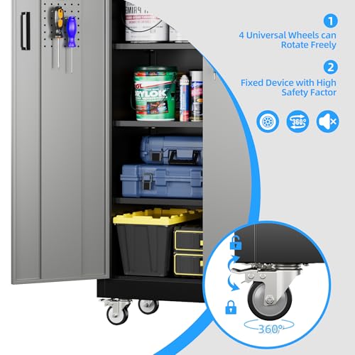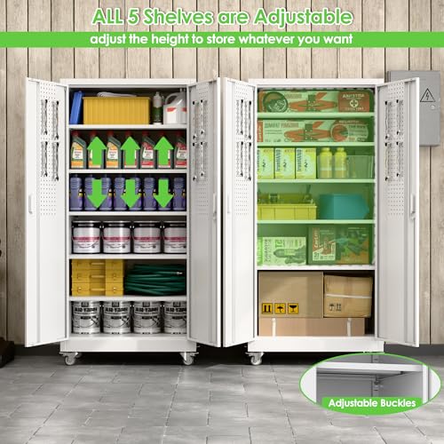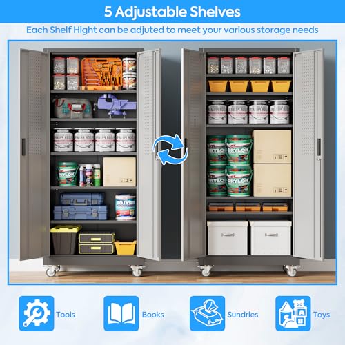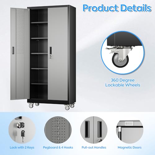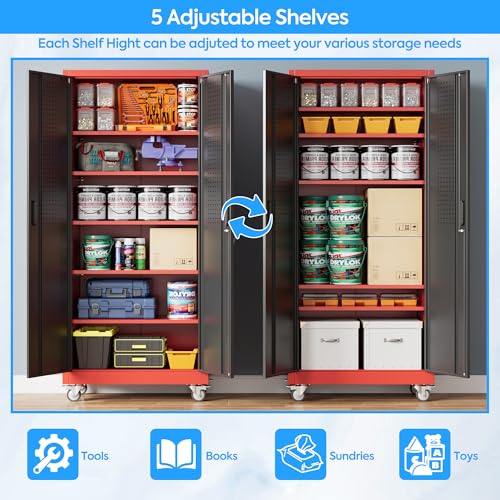 Metal Garage Storage Cabinet, Tall Garage Cabinets with 5 Adjustable Shelves, Steel Tool Storage Cabinet with Wheels,Lockable Heavy Duty Metal Cabinets for Home, Warehouse,Basement
