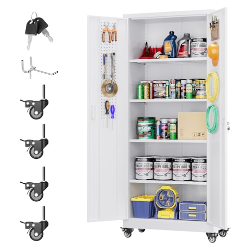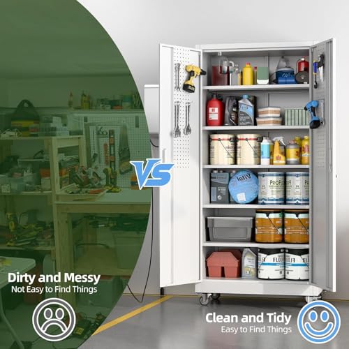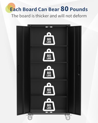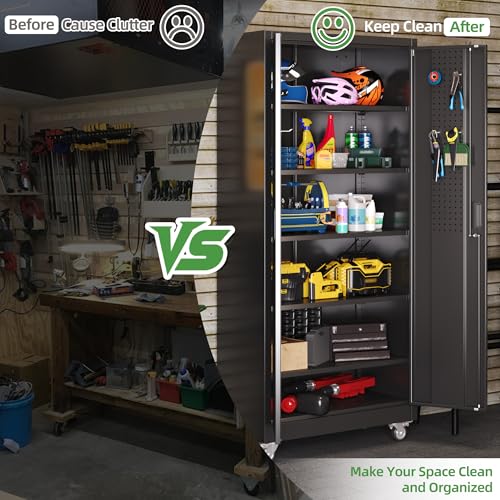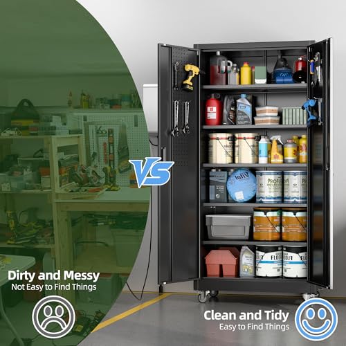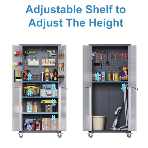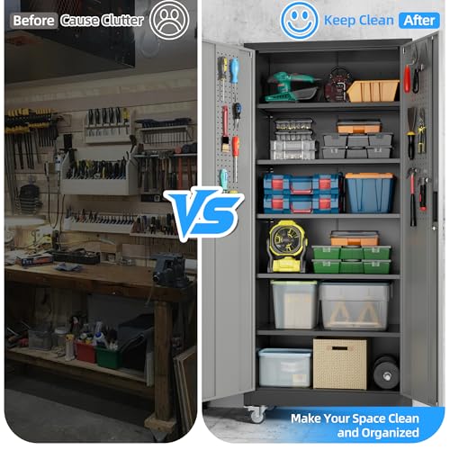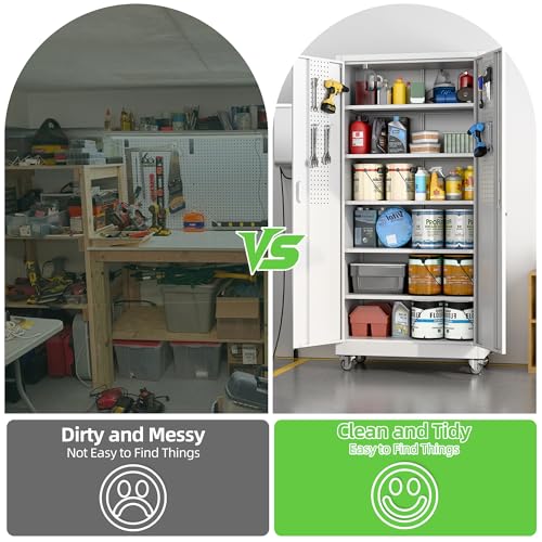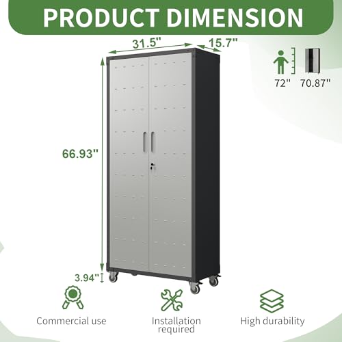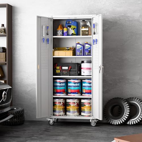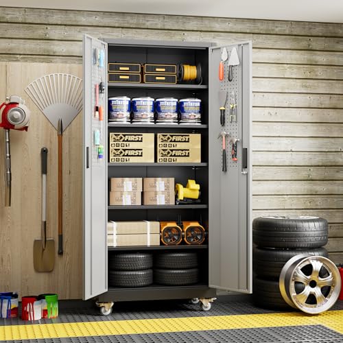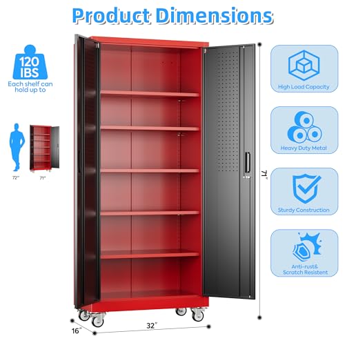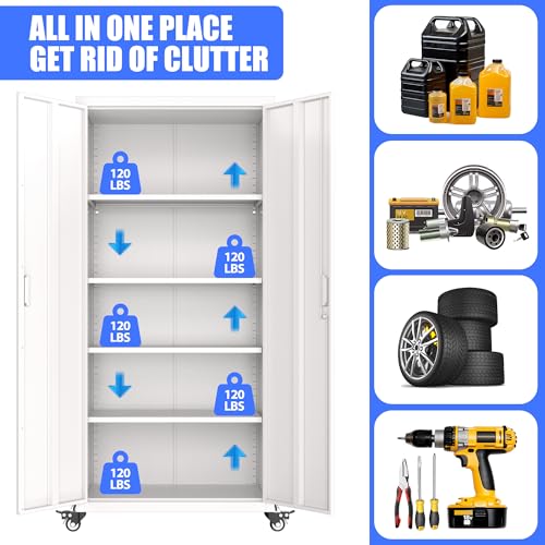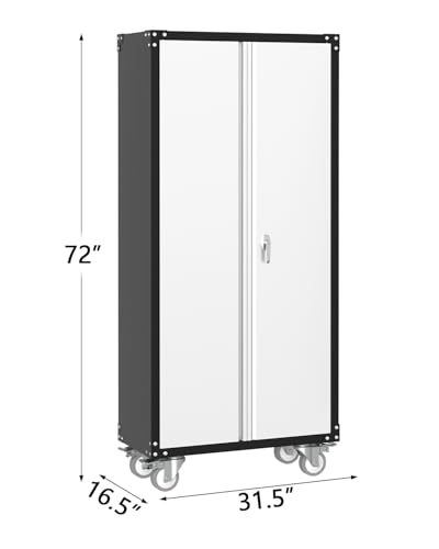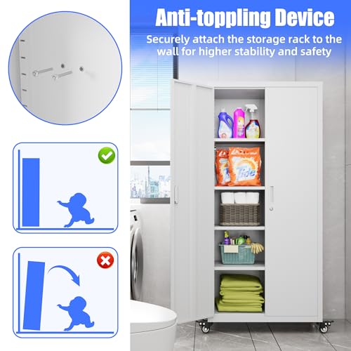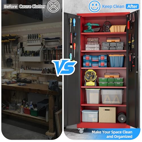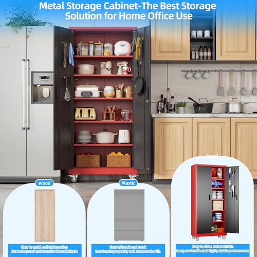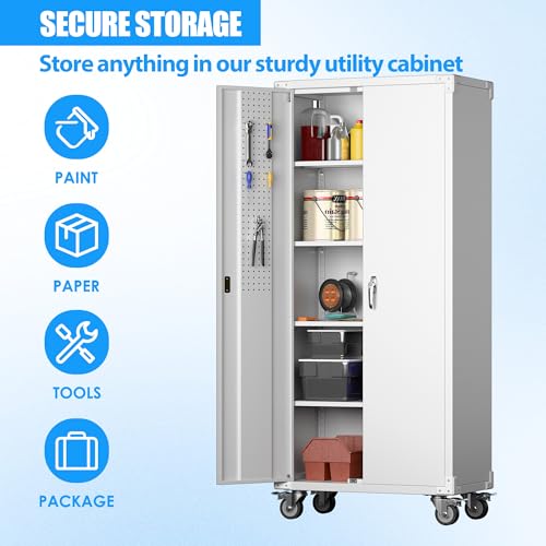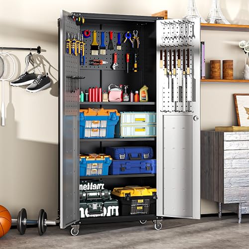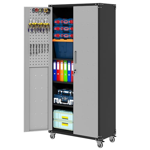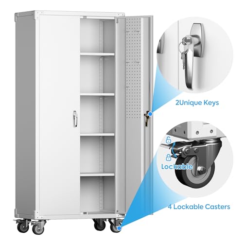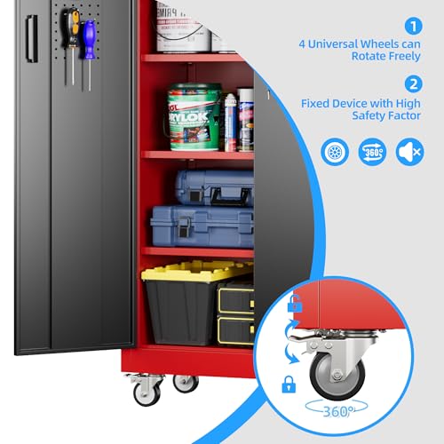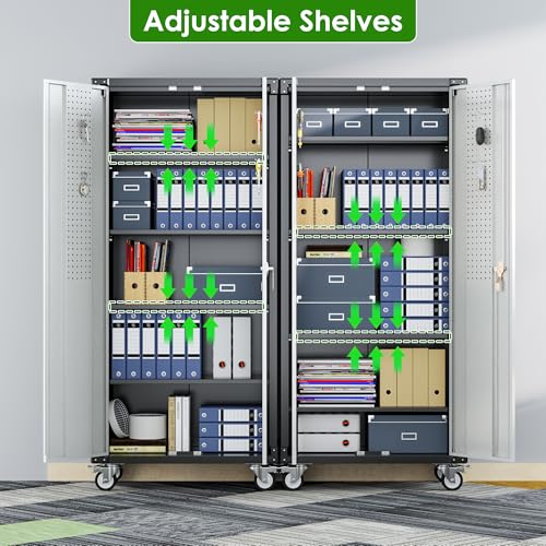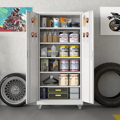 Metal Garage Storage Cabinet, Tall Garage Cabinets with 5 Adjustable Shelves, Steel Tool Storage Cabinet with Wheels,Lockable Heavy Duty Metal Cabinets for Home, Warehouse,Basement
