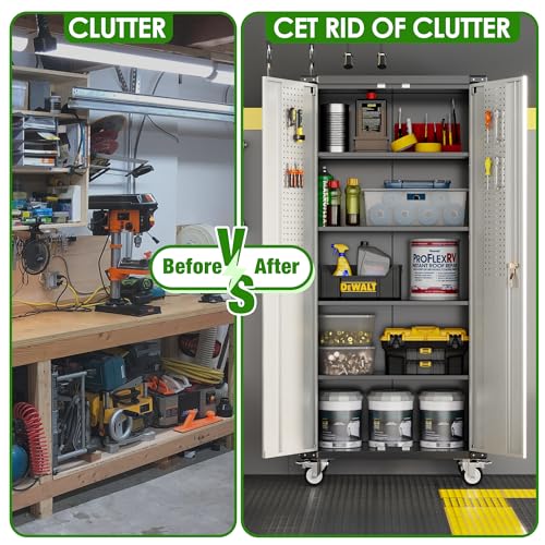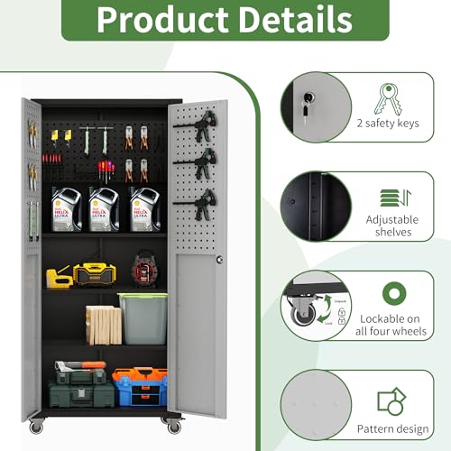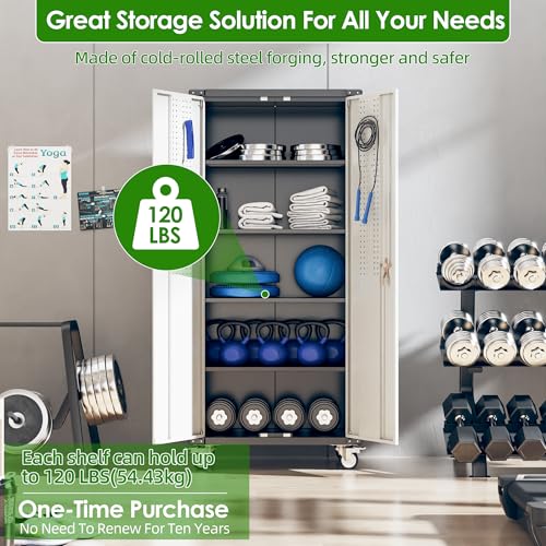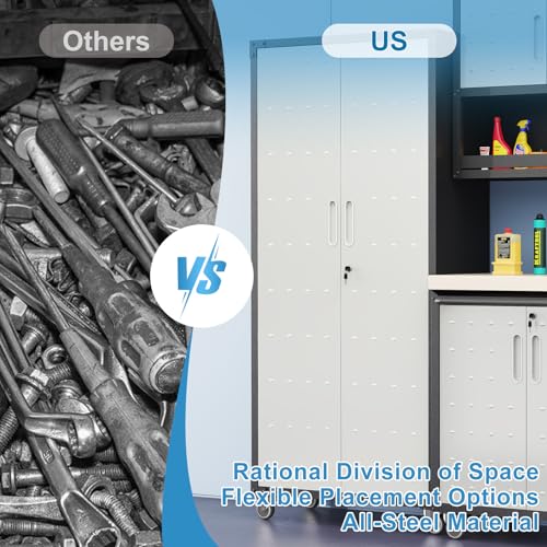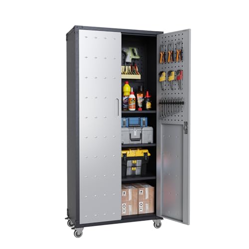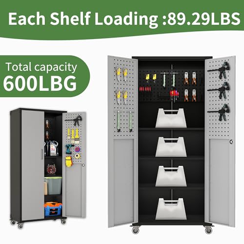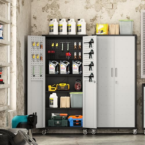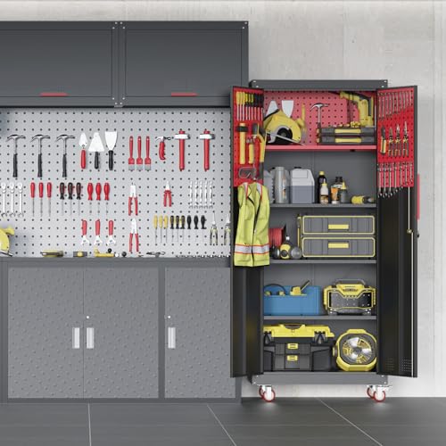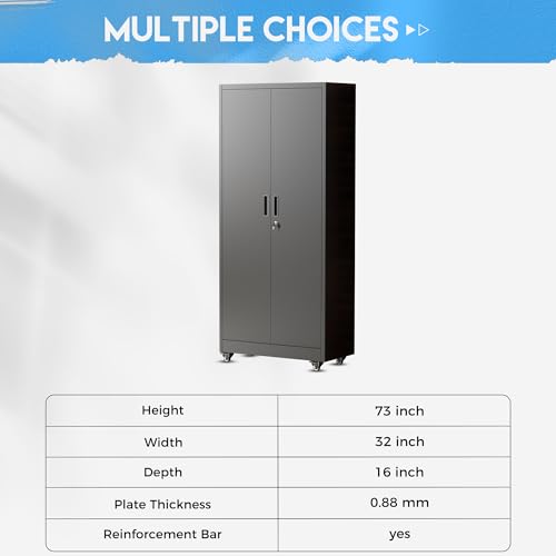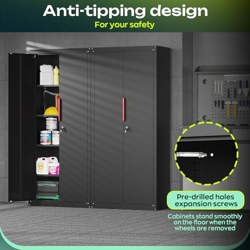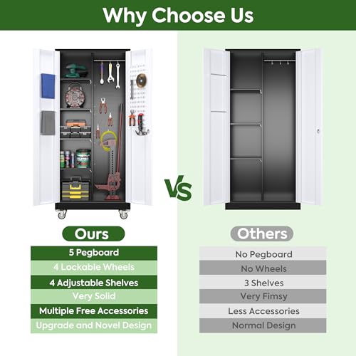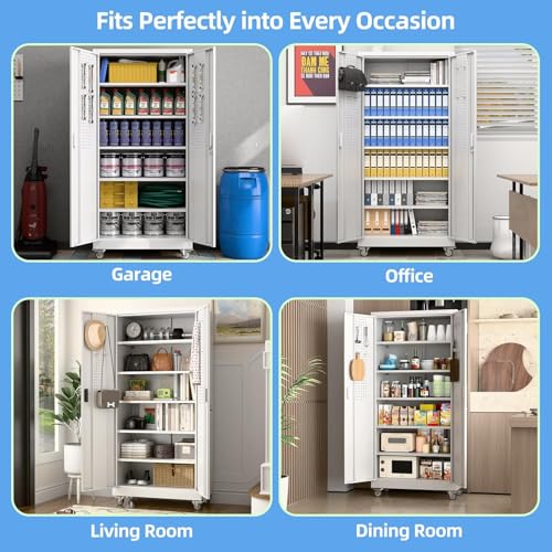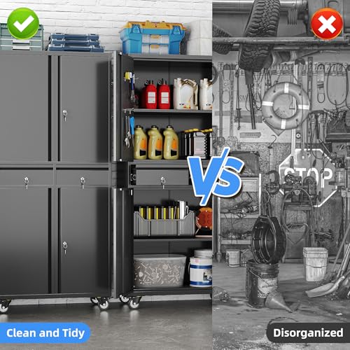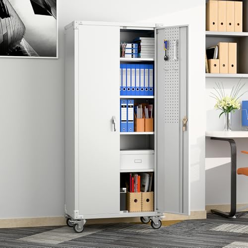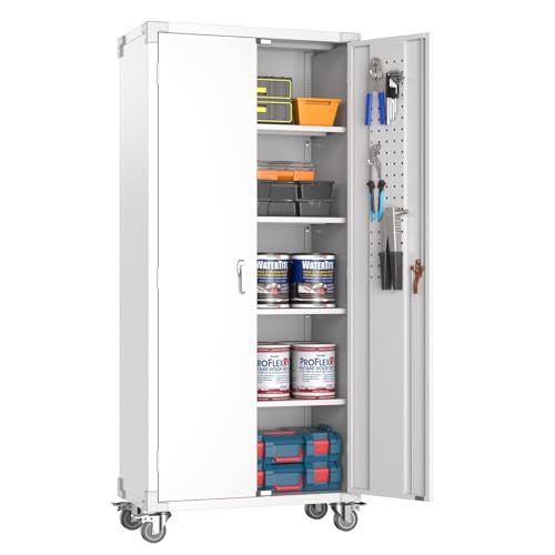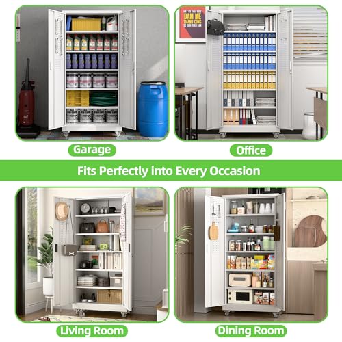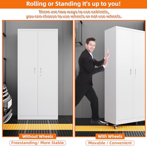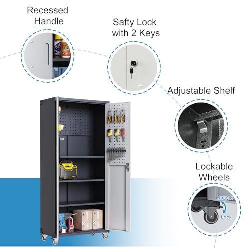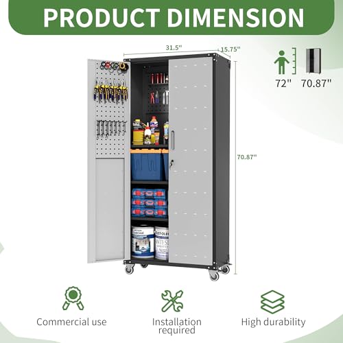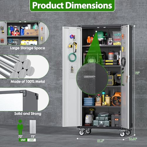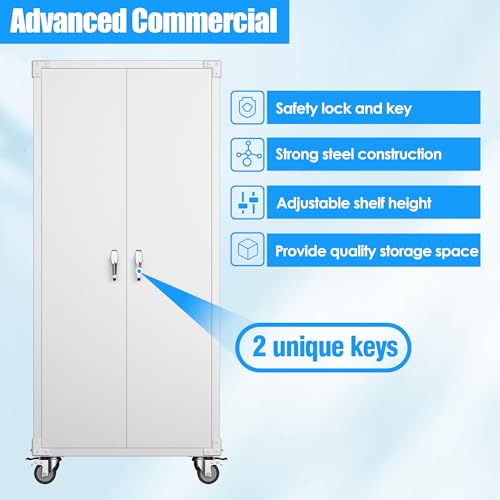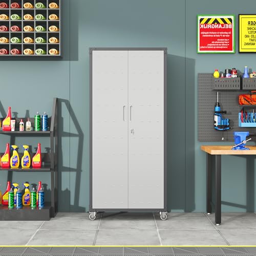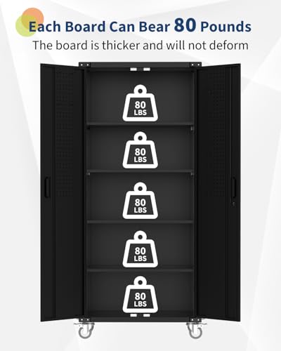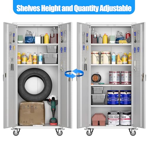 Metal Garage Storage Cabinet, Tall Garage Cabinets with 5 Adjustable Shelves, Steel Tool Storage Cabinet with Wheels,Lockable Heavy Duty Metal Cabinets for Home, Warehouse,Basement