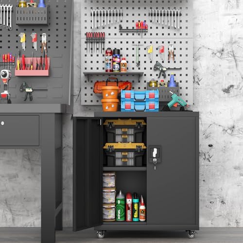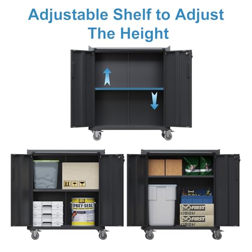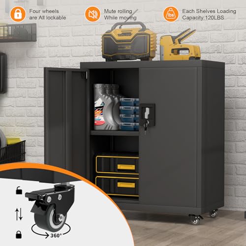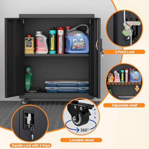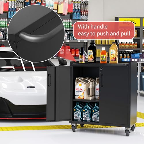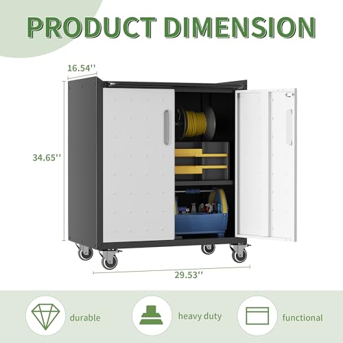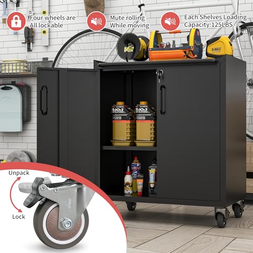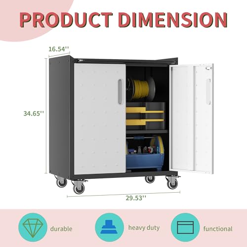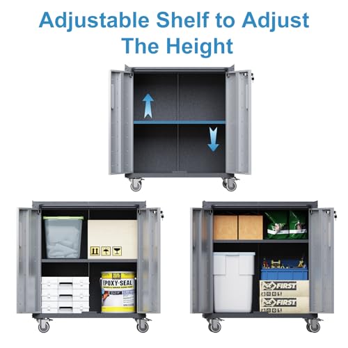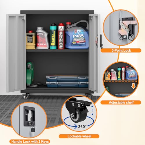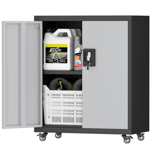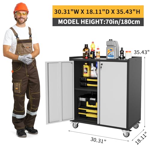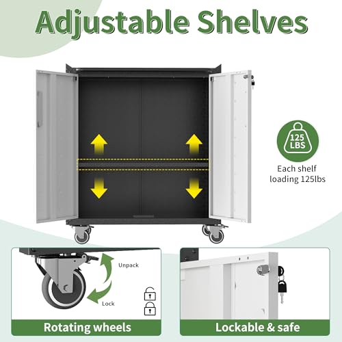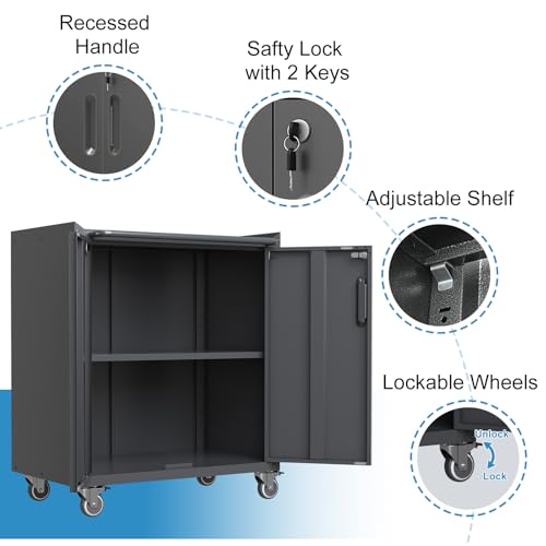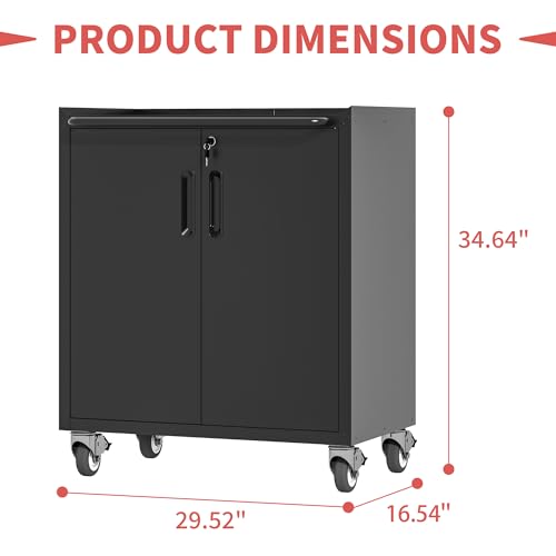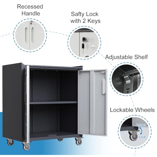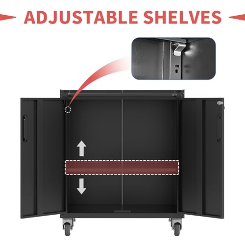 31.5''H Metal Garage Storage Cabinet with Wheels, Small Tool Storage Cabinets with Lock, Lockable Steel Rolling Tool Chest with Doors & Adjustable Shelves for Garage, Home, Office
