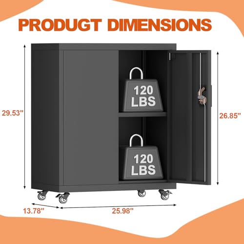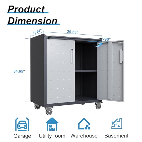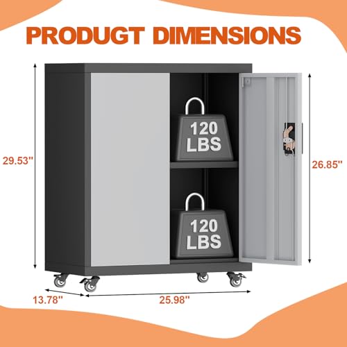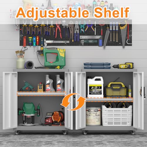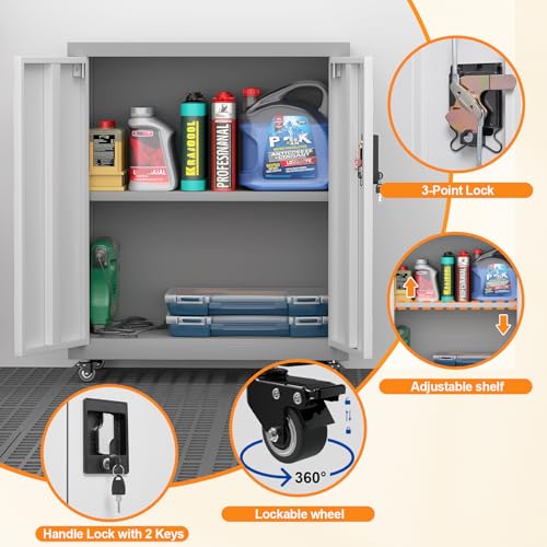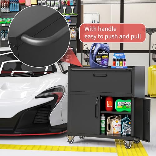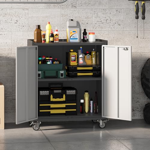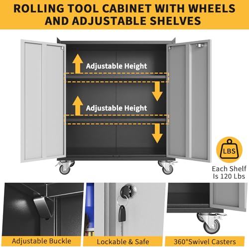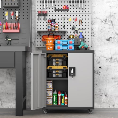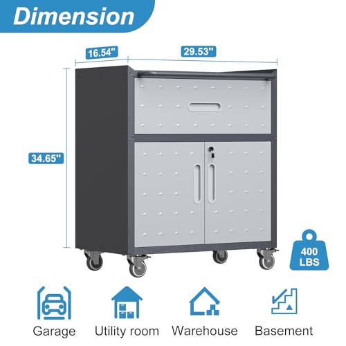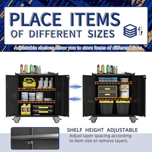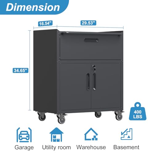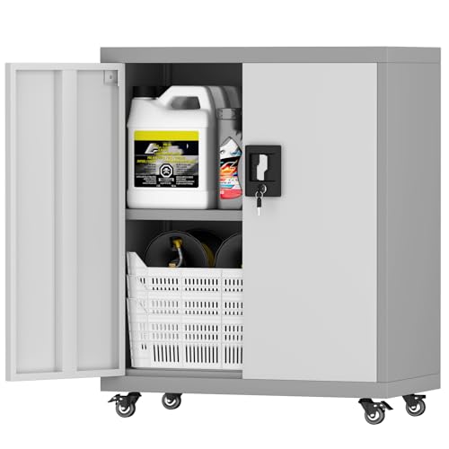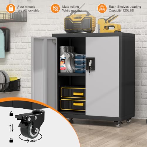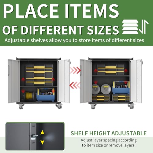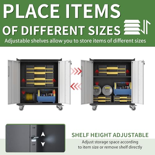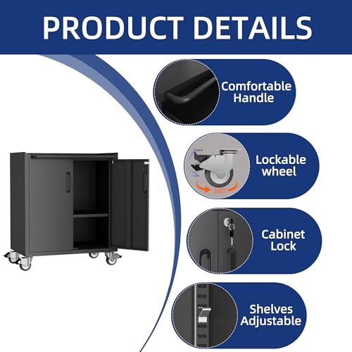 31.5''H Metal Garage Storage Cabinet with Wheels, Small Tool Storage Cabinets with Lock, Lockable Steel Rolling Tool Chest with Doors & Adjustable Shelves for Garage, Home, Office