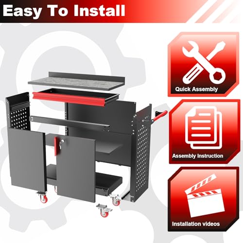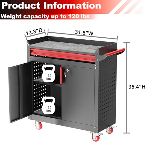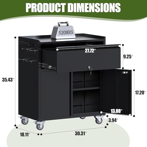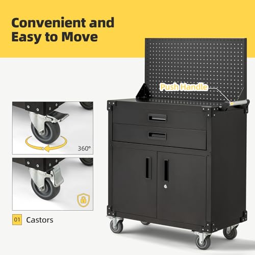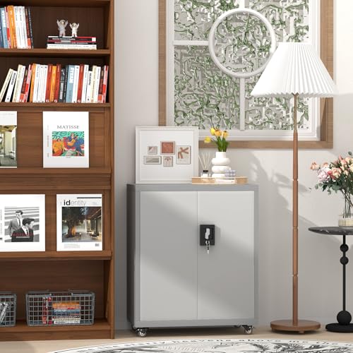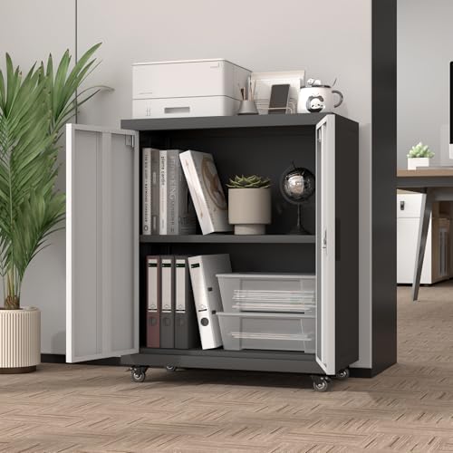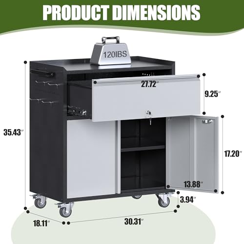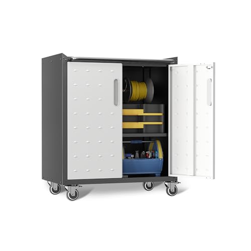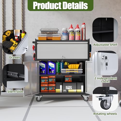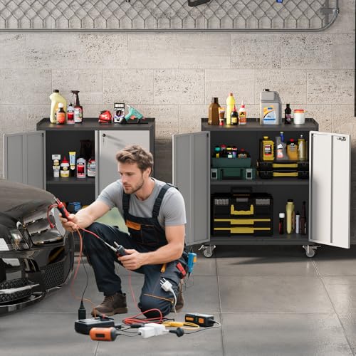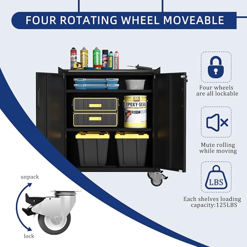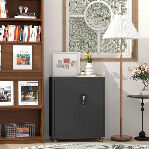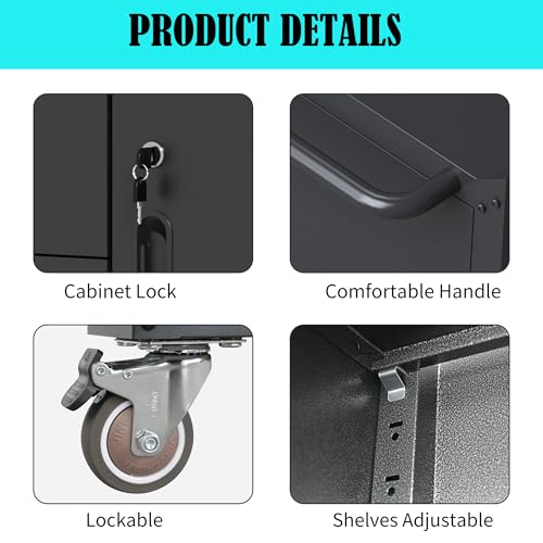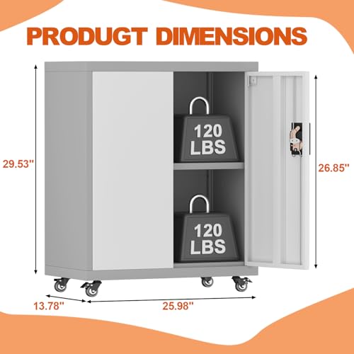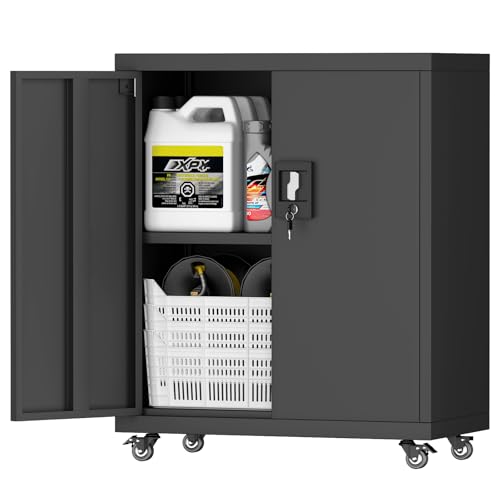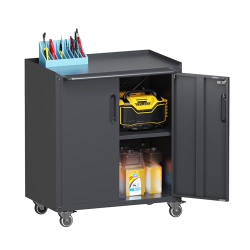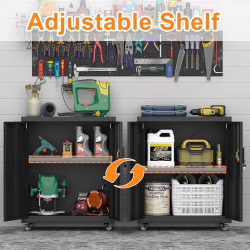 31.5''H Metal Garage Storage Cabinet with Wheels, Small Tool Storage Cabinets with Lock, Lockable Steel Rolling Tool Chest with Doors & Adjustable Shelves for Garage, Home, Office