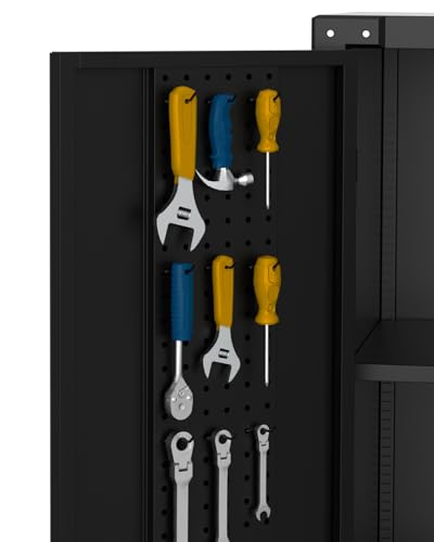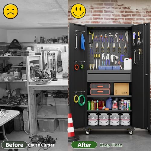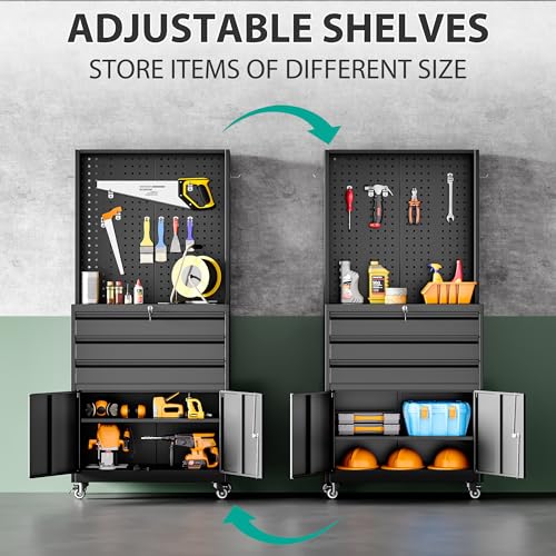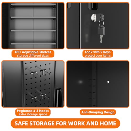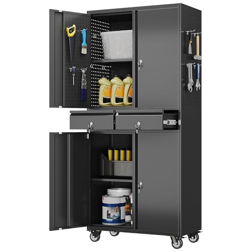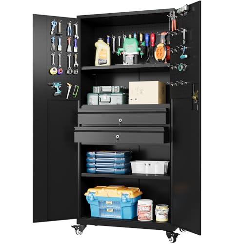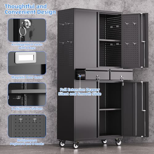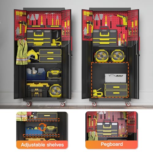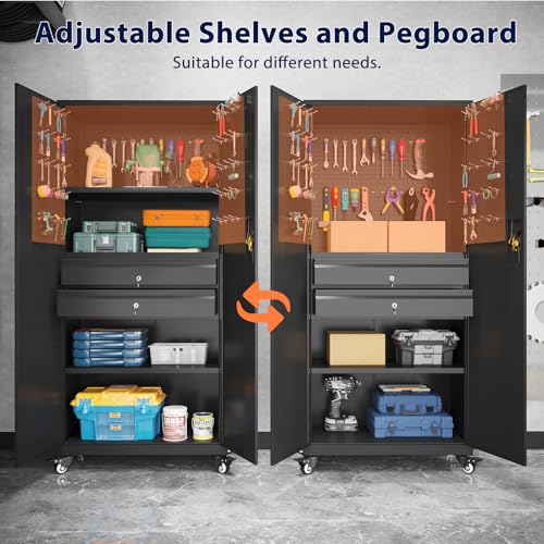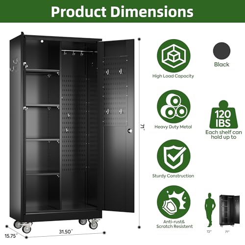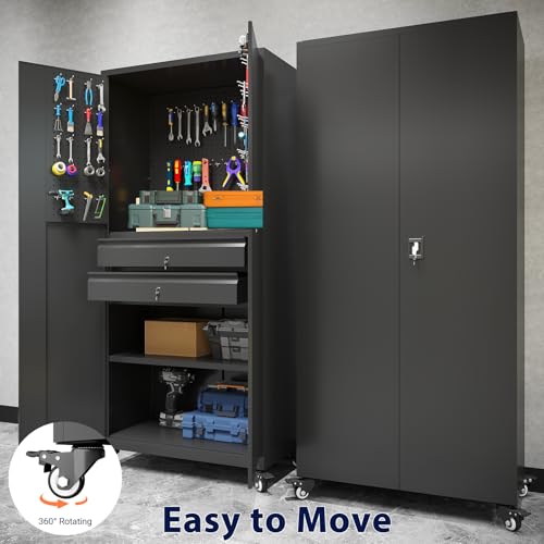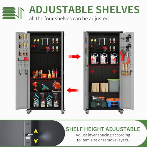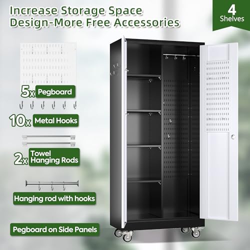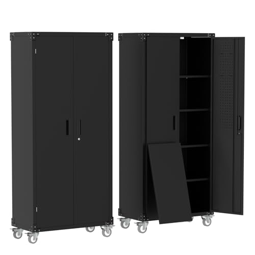 Metal Storage Cabinet 72"H with Wheels, Steel Tool Cabinet with Pegboard and 4 Adjustable Shelves, Lockable Rolling Garage Cabinet for Home,Garage,Office Organization (Deep Black) (with wheels, black)