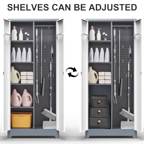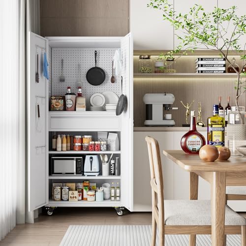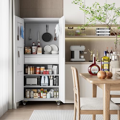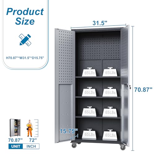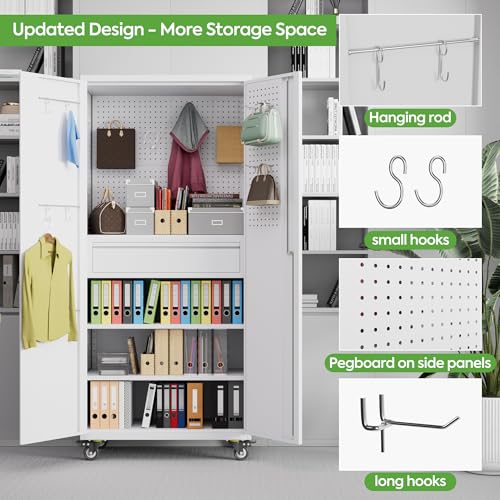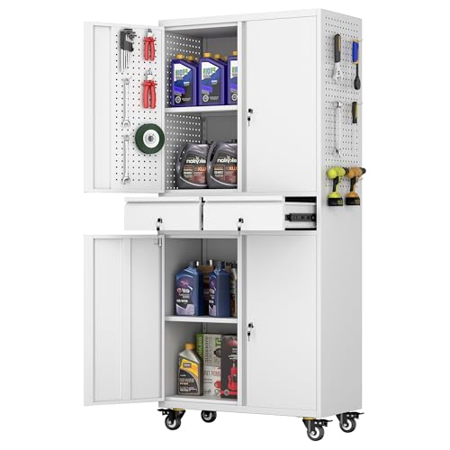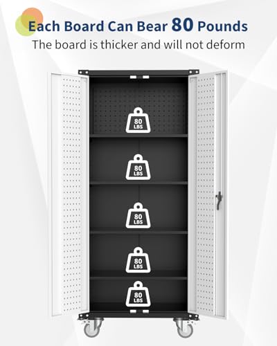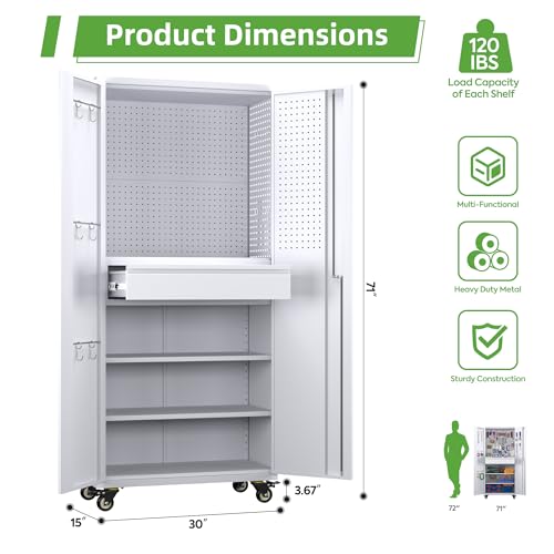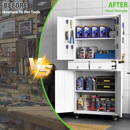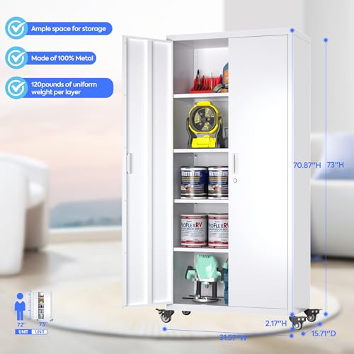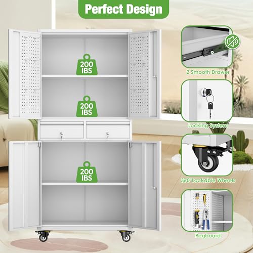 71" H×34" W×18" D Metal Garage Storage Cabinet with Wheels, Rolling Tool Storage Cabinet with 5 Adjustable Shelves and Pegboard for Garage Home Office Utility Room,Required Assembly,White
