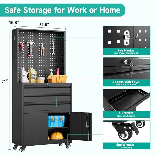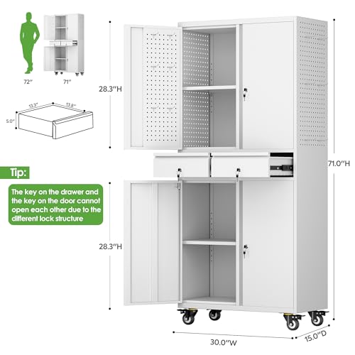 71" Metal Garage Storage Cabinet with Drawers and Wheels Rolling Tool Chest Cabinet with Pegboards, Lockable Storage Cabinets with Adjustable Shelves for Warehouse,Workshop,Garage, Basement