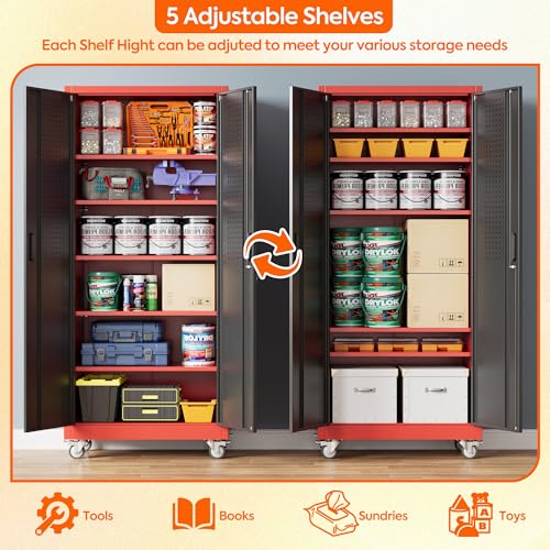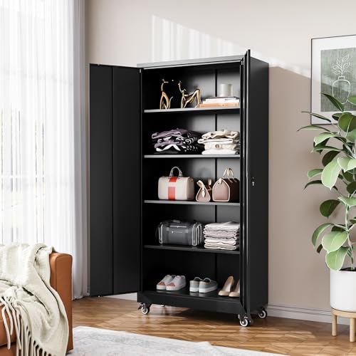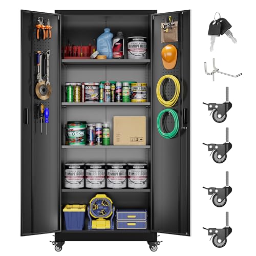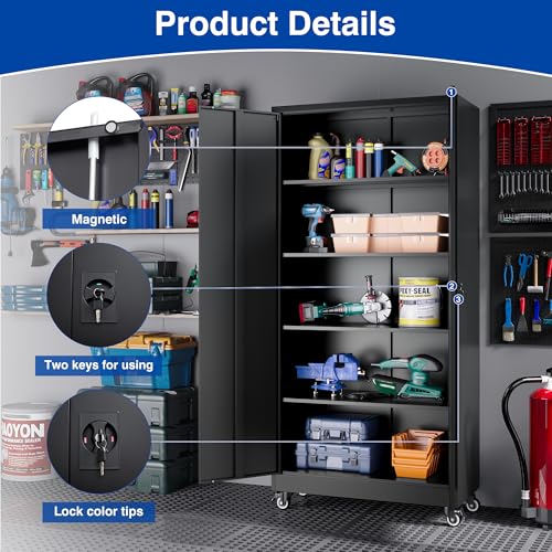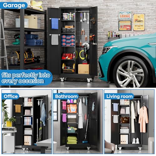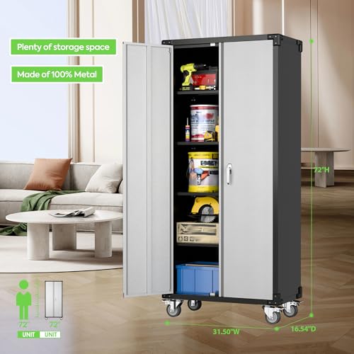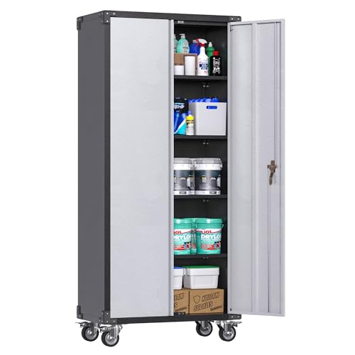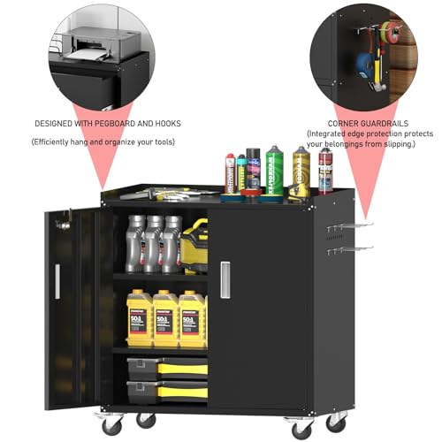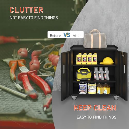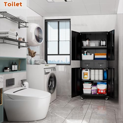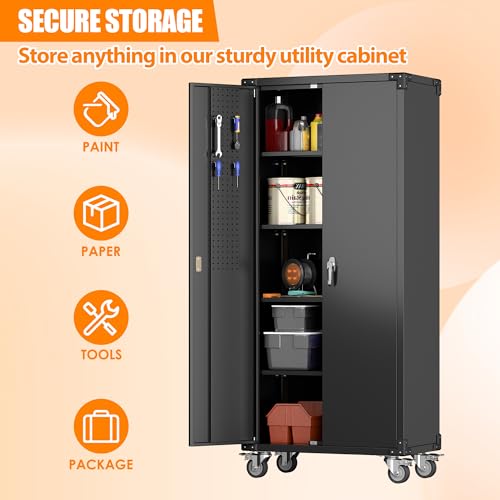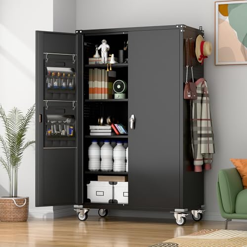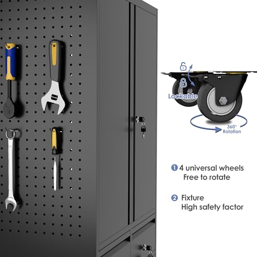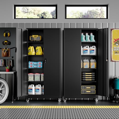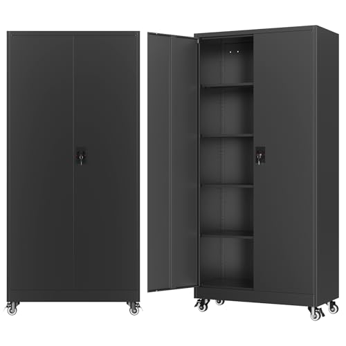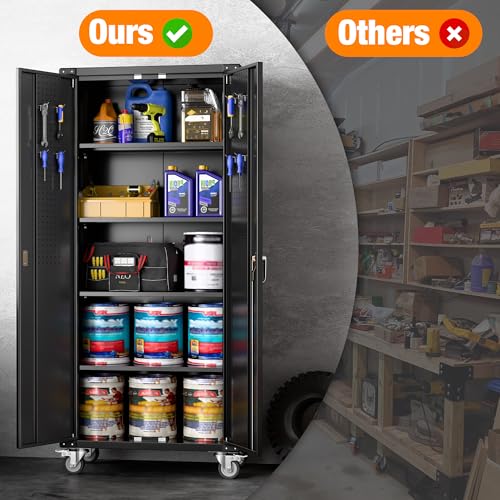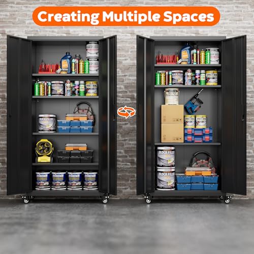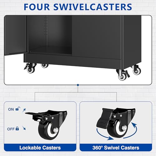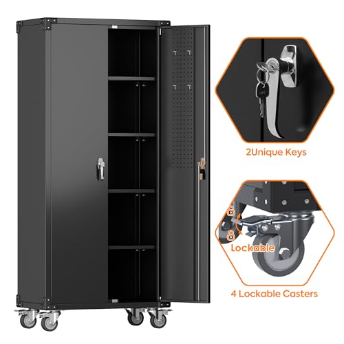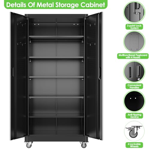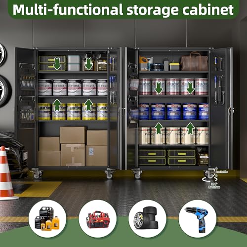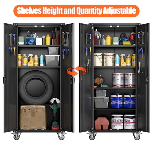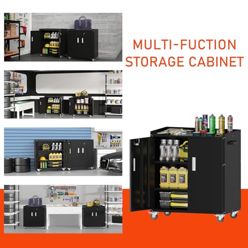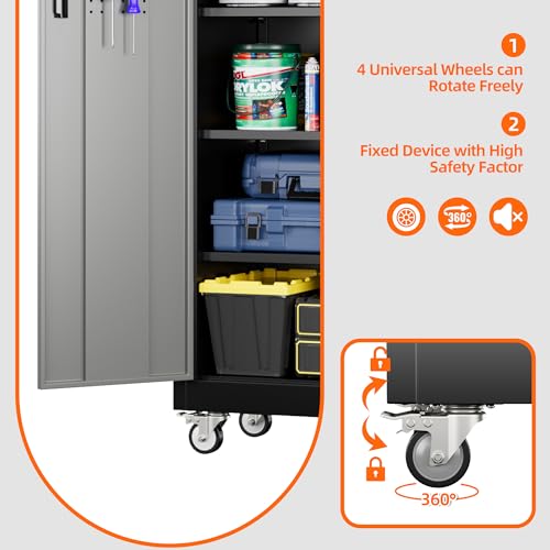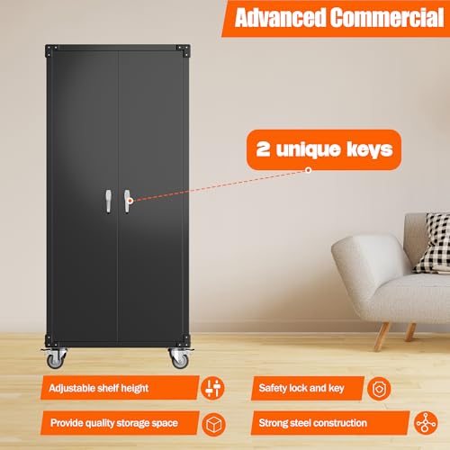 Metal Garage Storage Cabinet with Wheels,Metal Storage Cabinet with Adjustable Shelves,Steel Tool Cabinets with Locking Door for Home, School, Office, Garage (Black)
