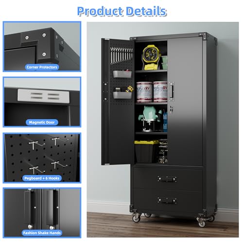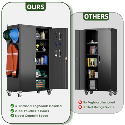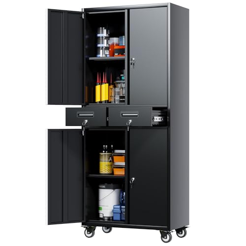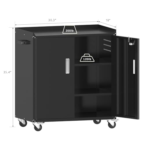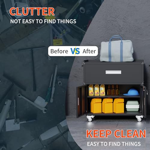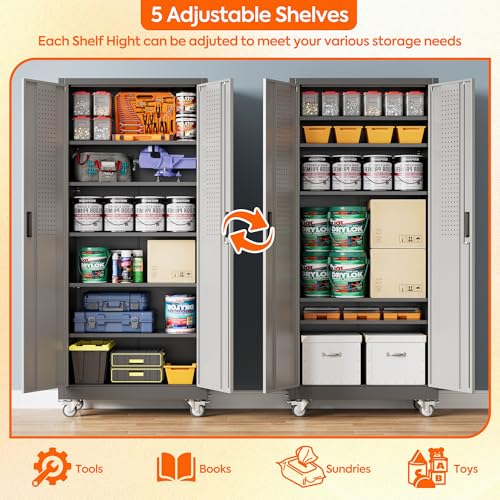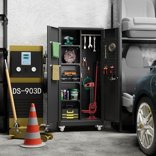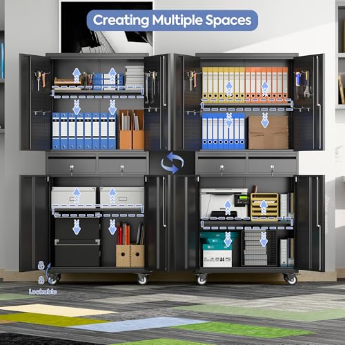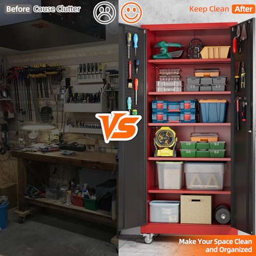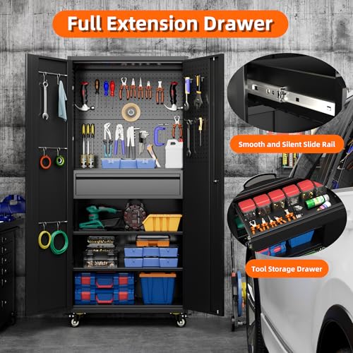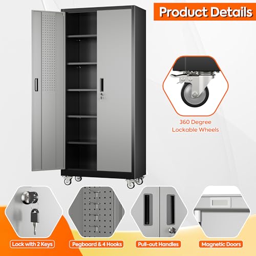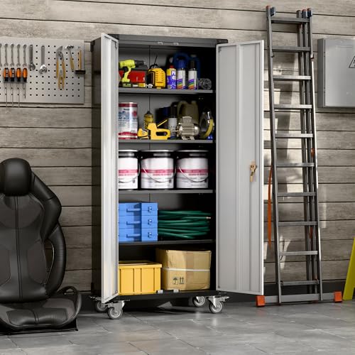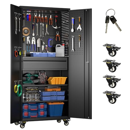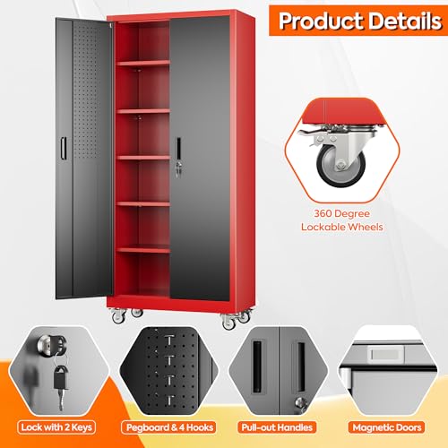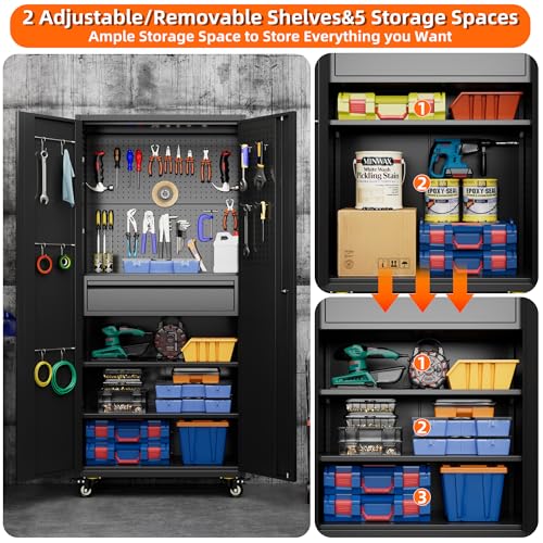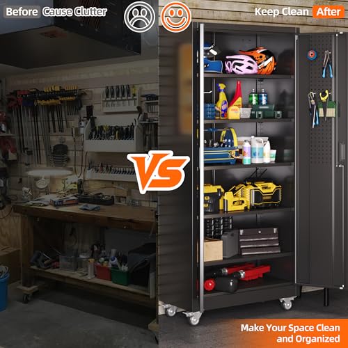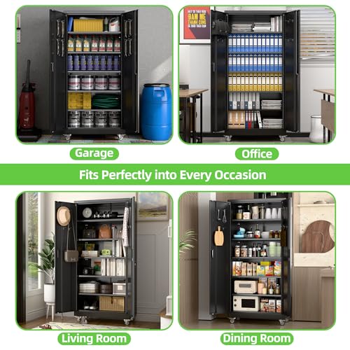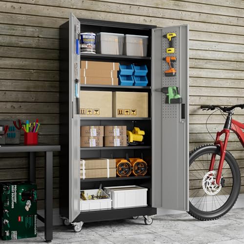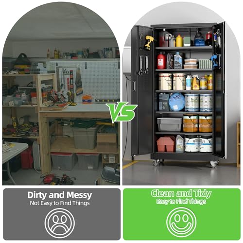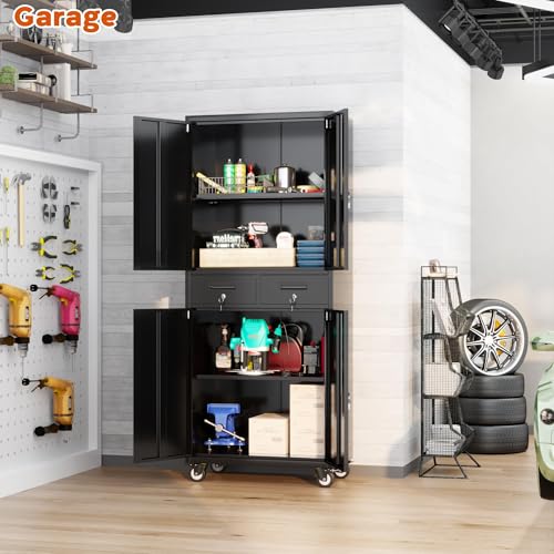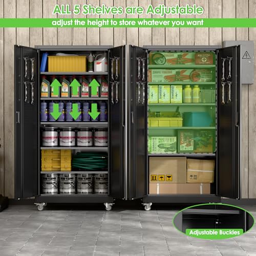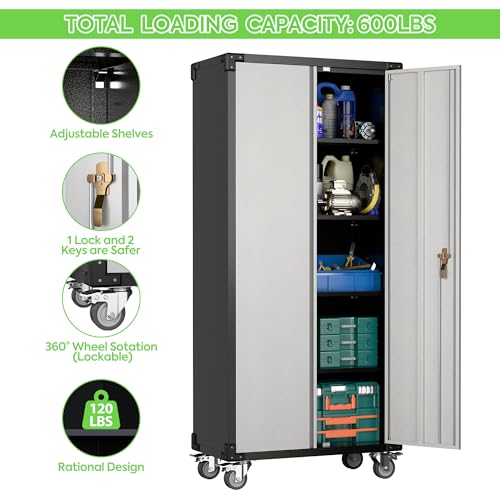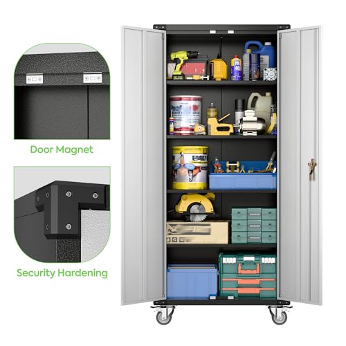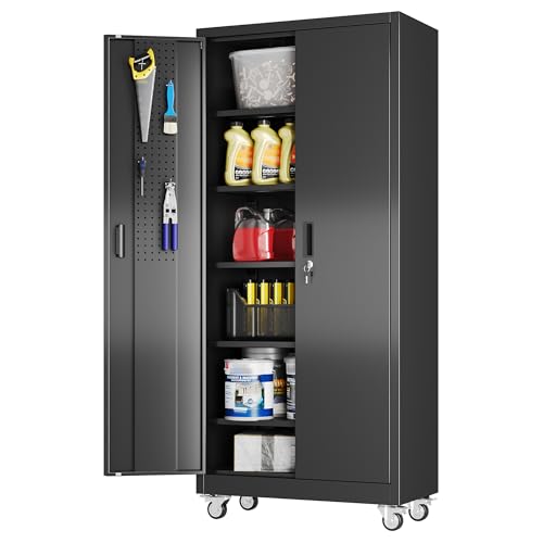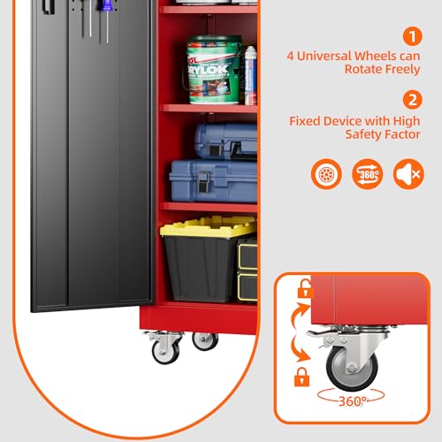 Metal Garage Storage Cabinet with Wheels,Metal Storage Cabinet with Adjustable Shelves,Steel Tool Cabinets with Locking Door for Home, School, Office, Garage (Black)