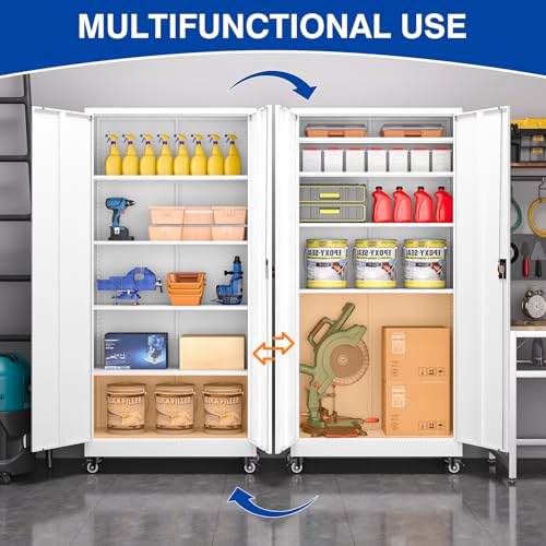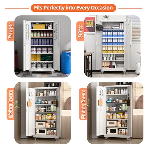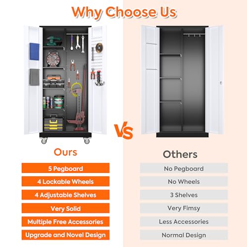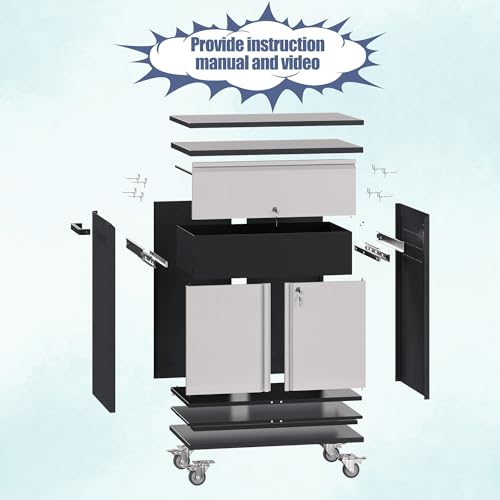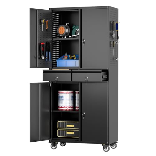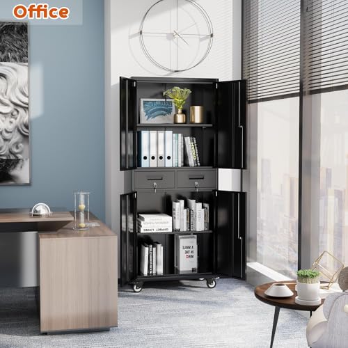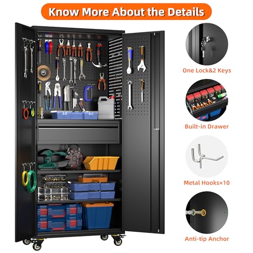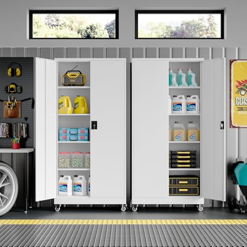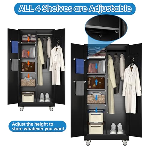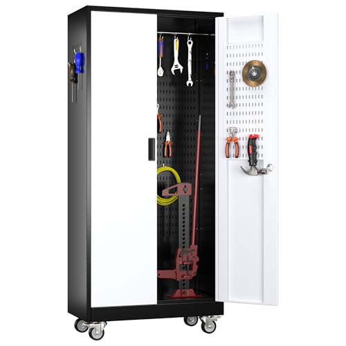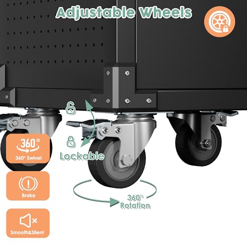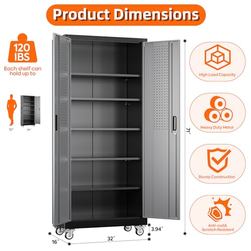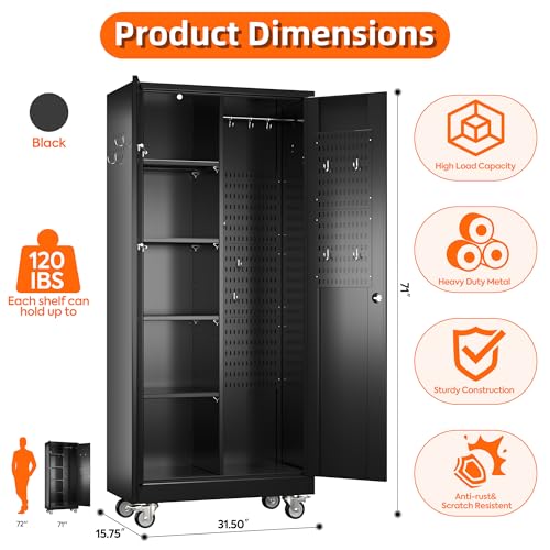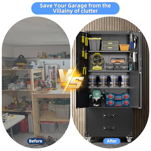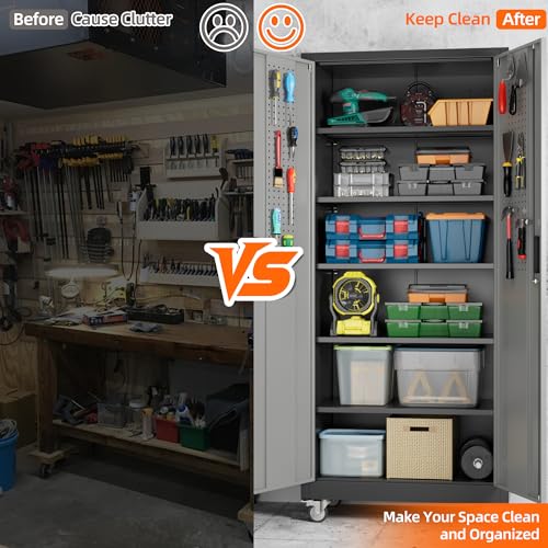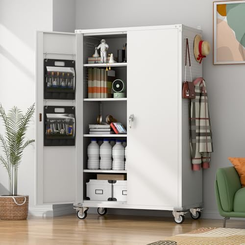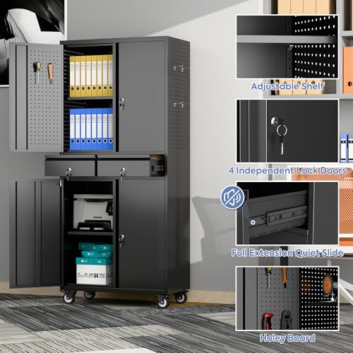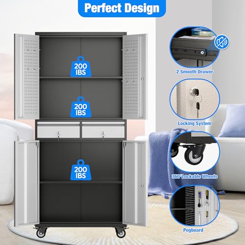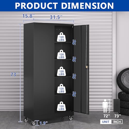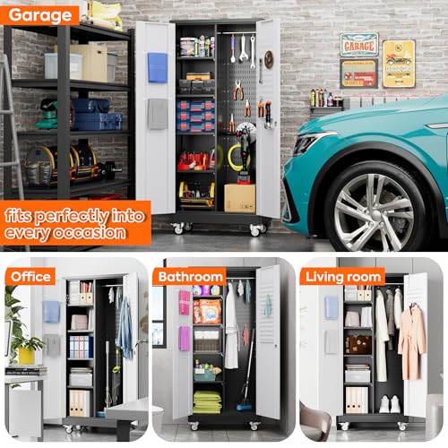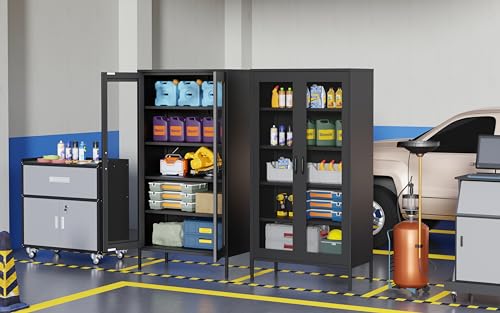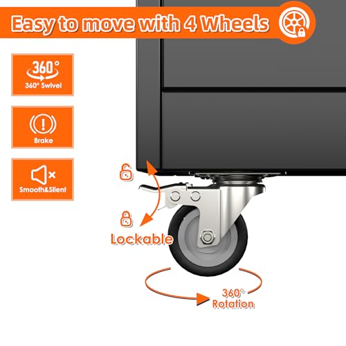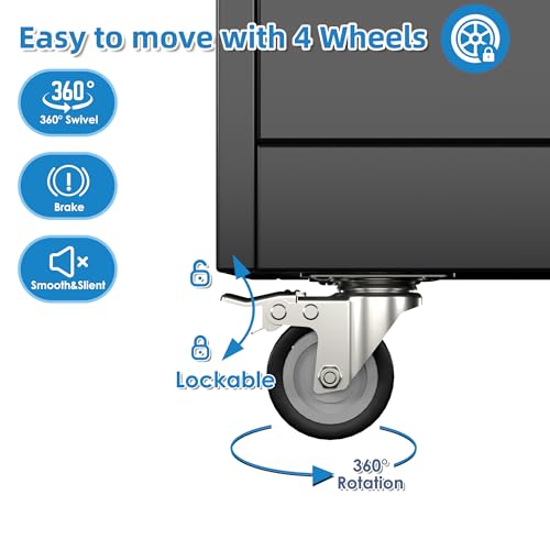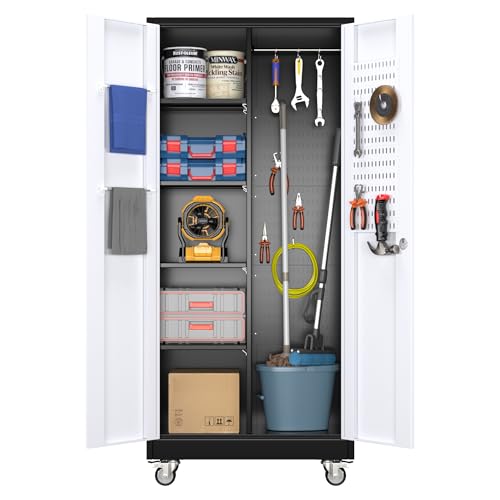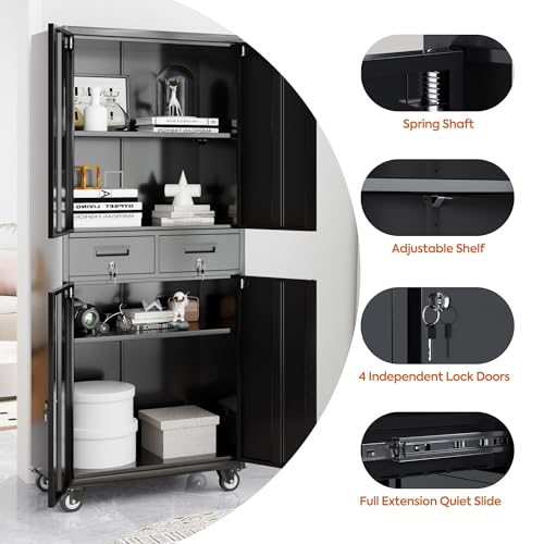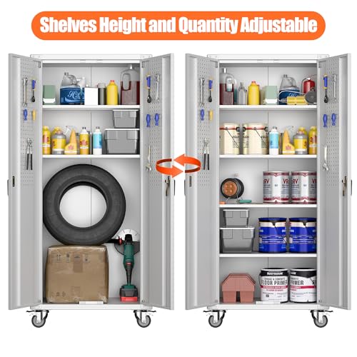Metal Garage Storage Cabinet with Wheels,Metal Storage Cabinet with Adjustable Shelves,Steel Tool Cabinets with Locking Door for Home, School, Office, Garage (Black)
