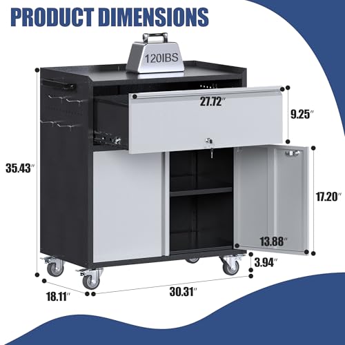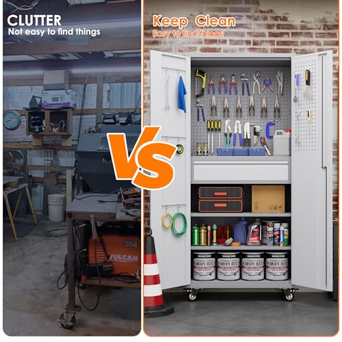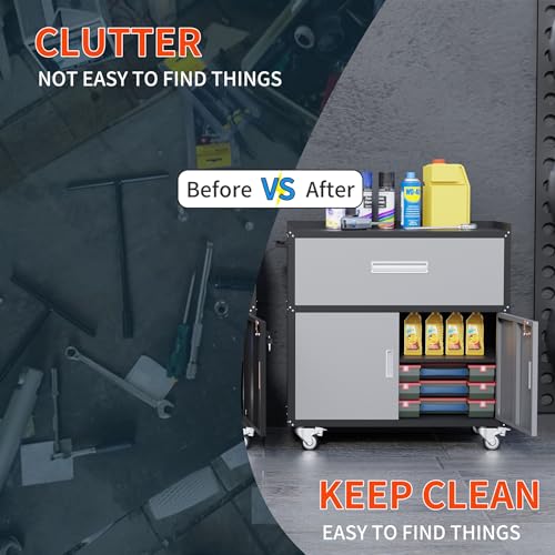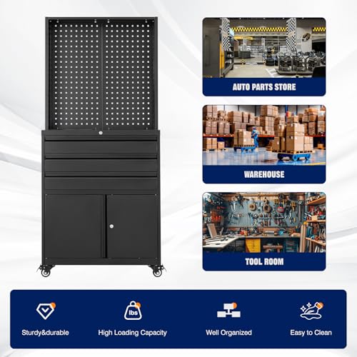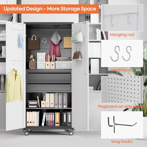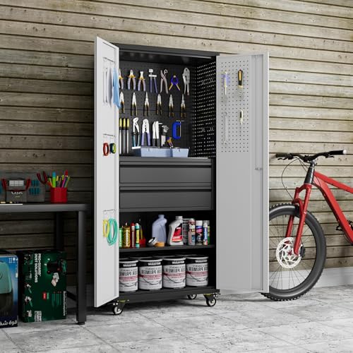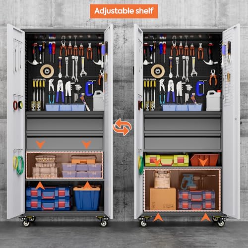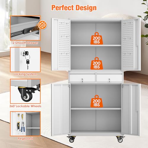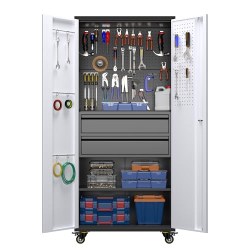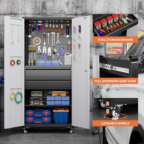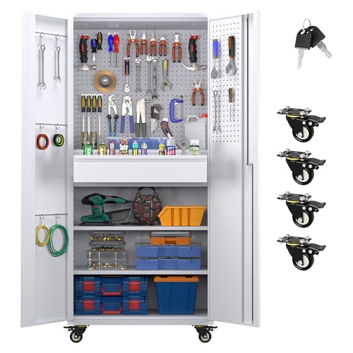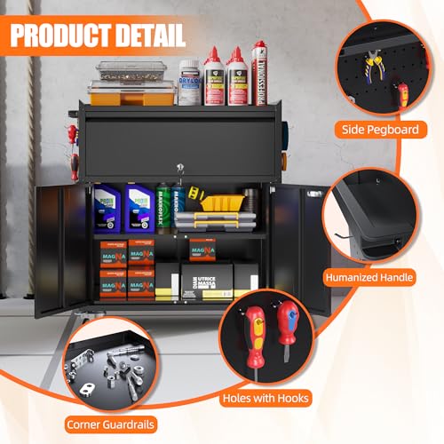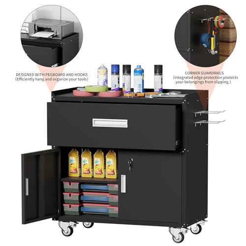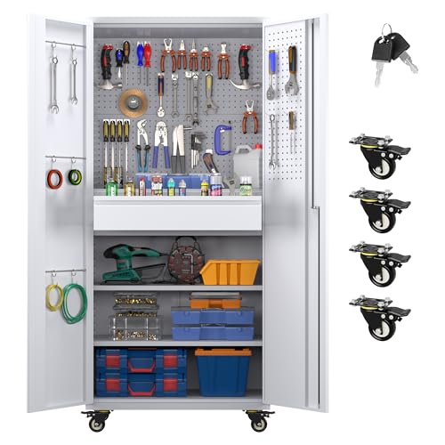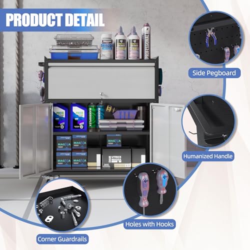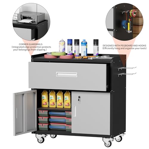 Garage Storage Cabinet, Metal Storage Cabinet with 1 Locking Door and 2 Drawers, Heavy Duty Rolling Workbench Table with Wheels and Pegboards for Garage, Office and Tool Room