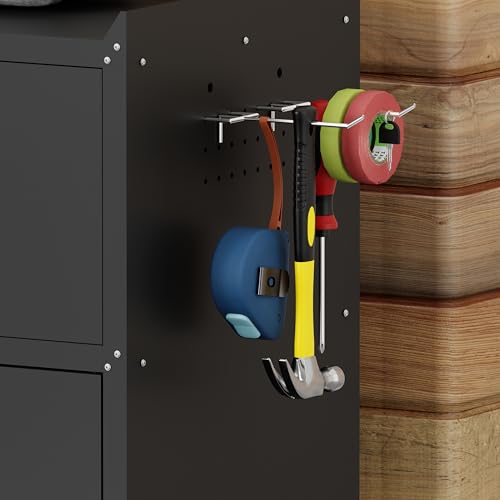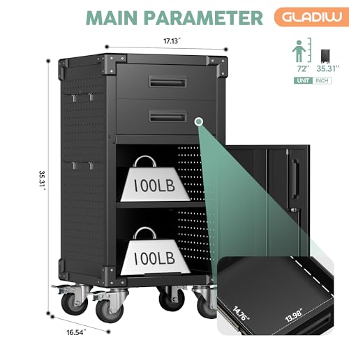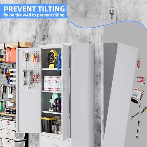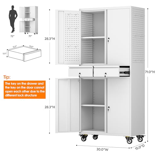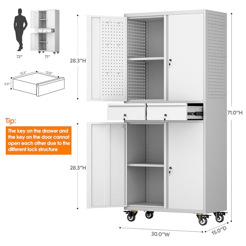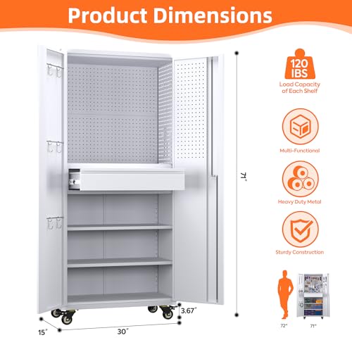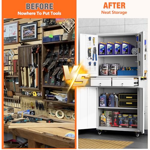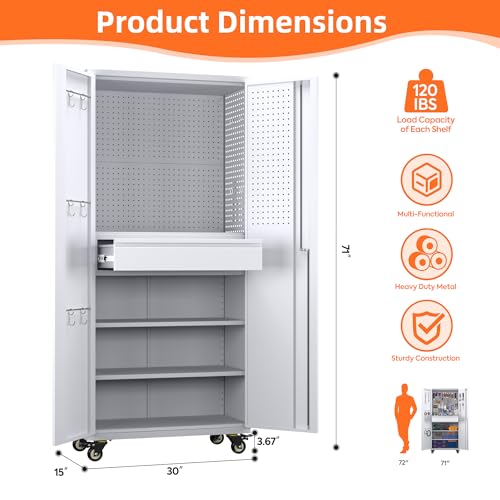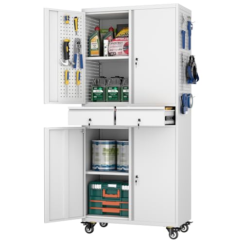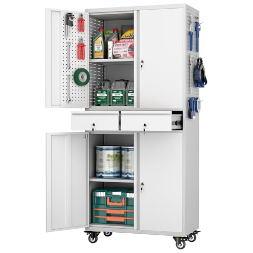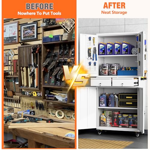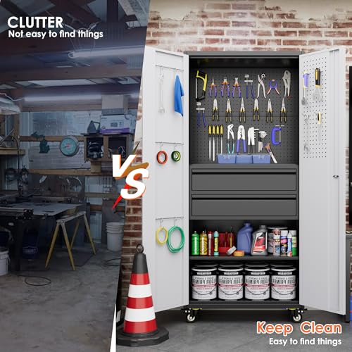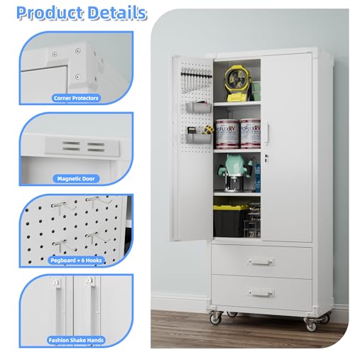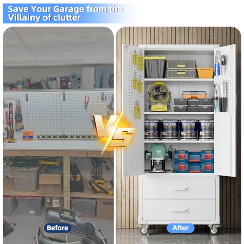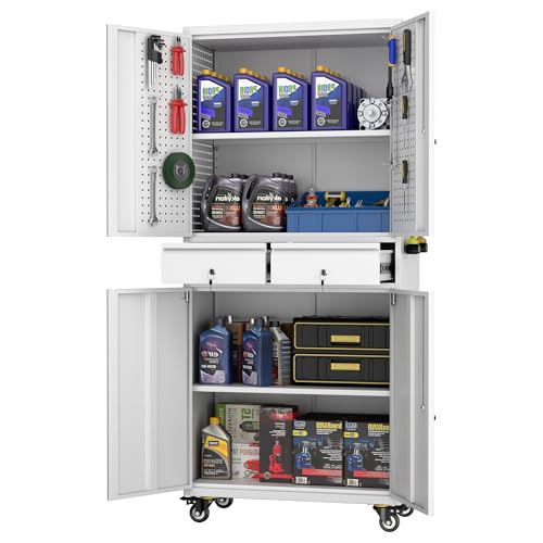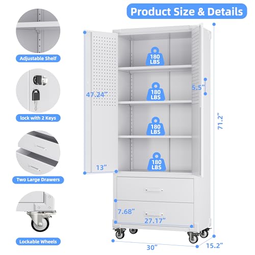 Garage Storage Cabinet, Metal Storage Cabinet with 1 Locking Door and 2 Drawers, Heavy Duty Rolling Workbench Table with Wheels and Pegboards for Garage, Office and Tool Room