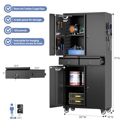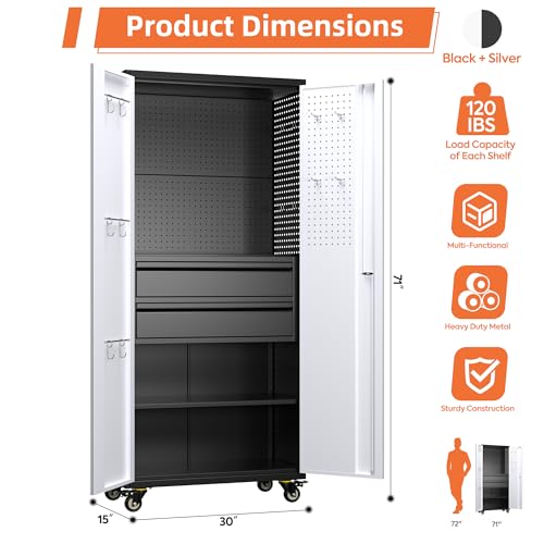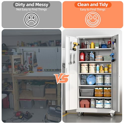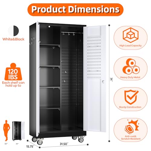 71''H Metal Garage Storage Cabinet with Pegboard, Rolling Tool Cabinets on Wheels with 5 Adjustable Shelves for Garage Office School Home Warehouse Utility Room, Assembly Required,Black