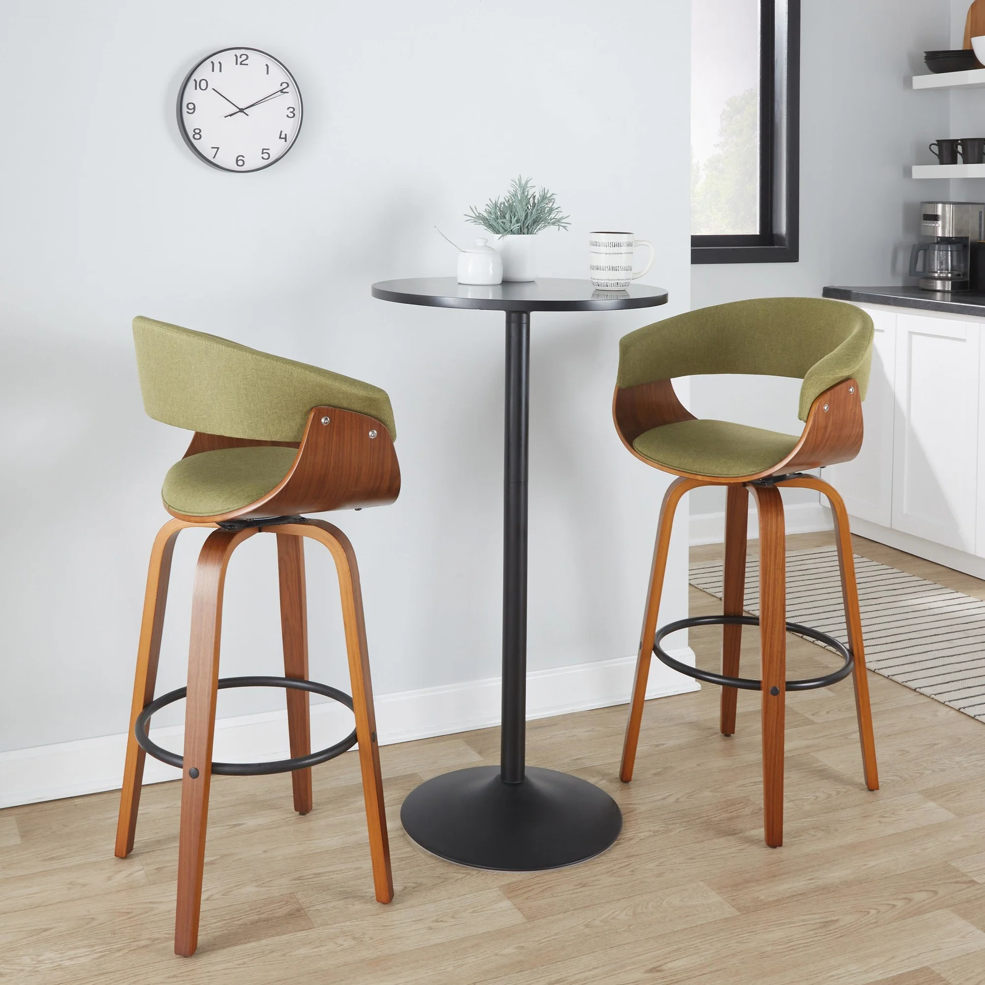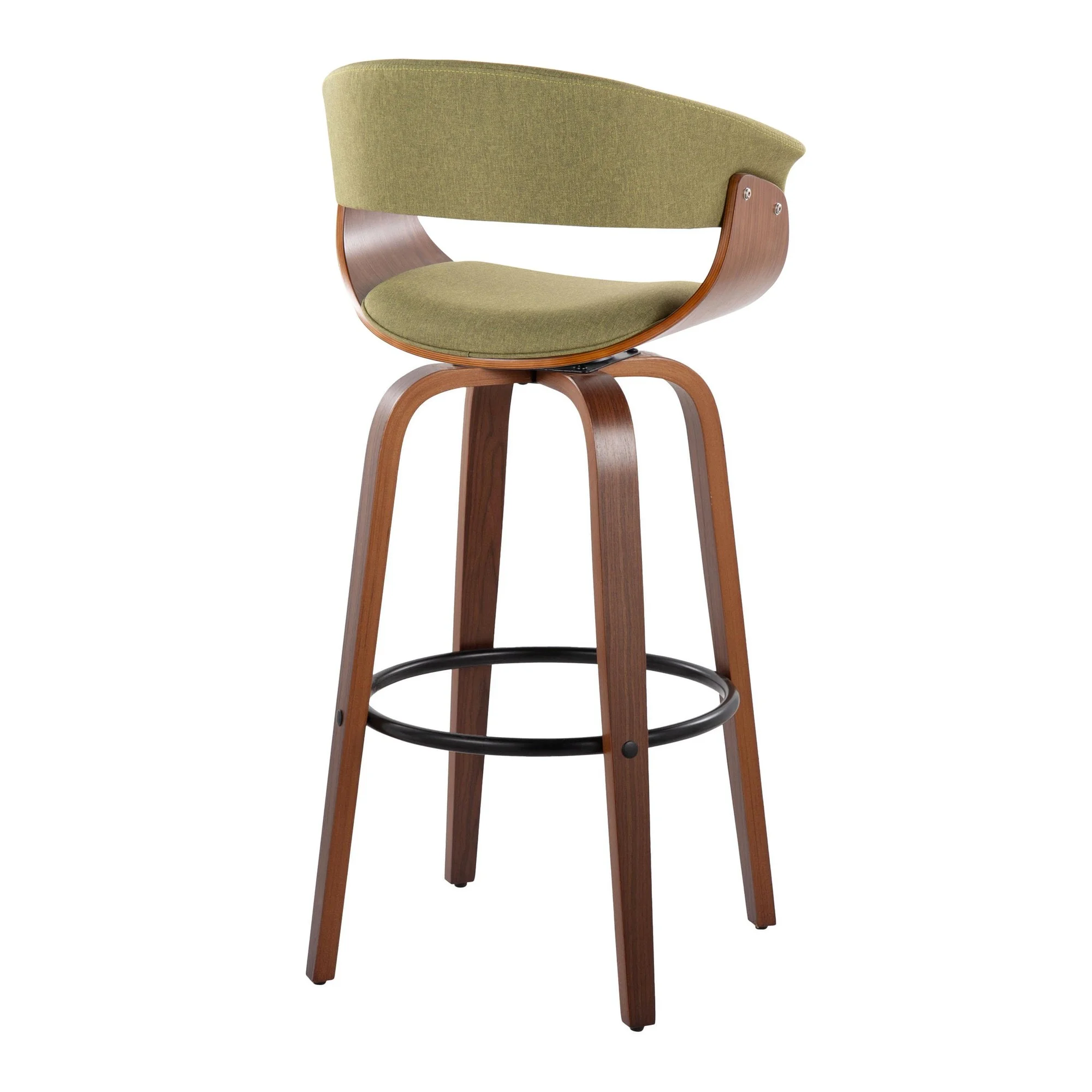 Vintage Mod 30" Mid-Century Modern Fixed-Height Barstool with Swivel in Walnut Wood and Green Fabric with Round Black Metal Footrest by LumiSource - Set of 2