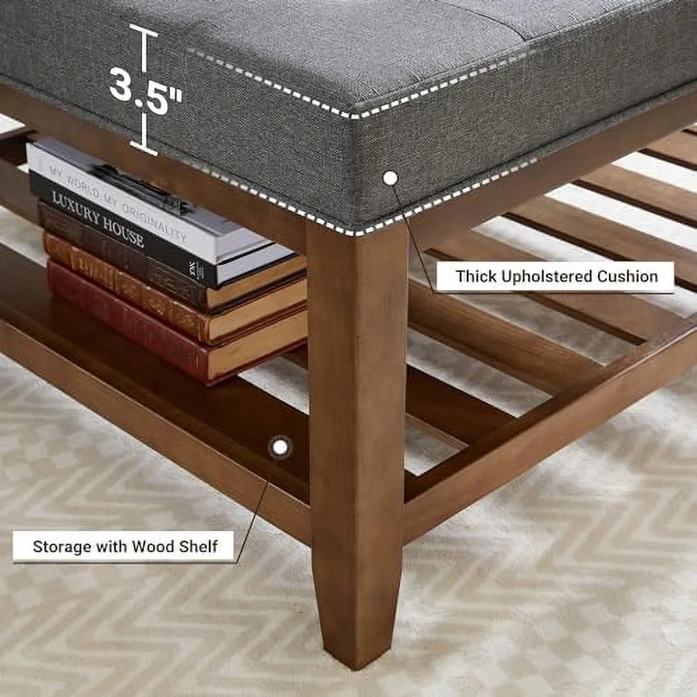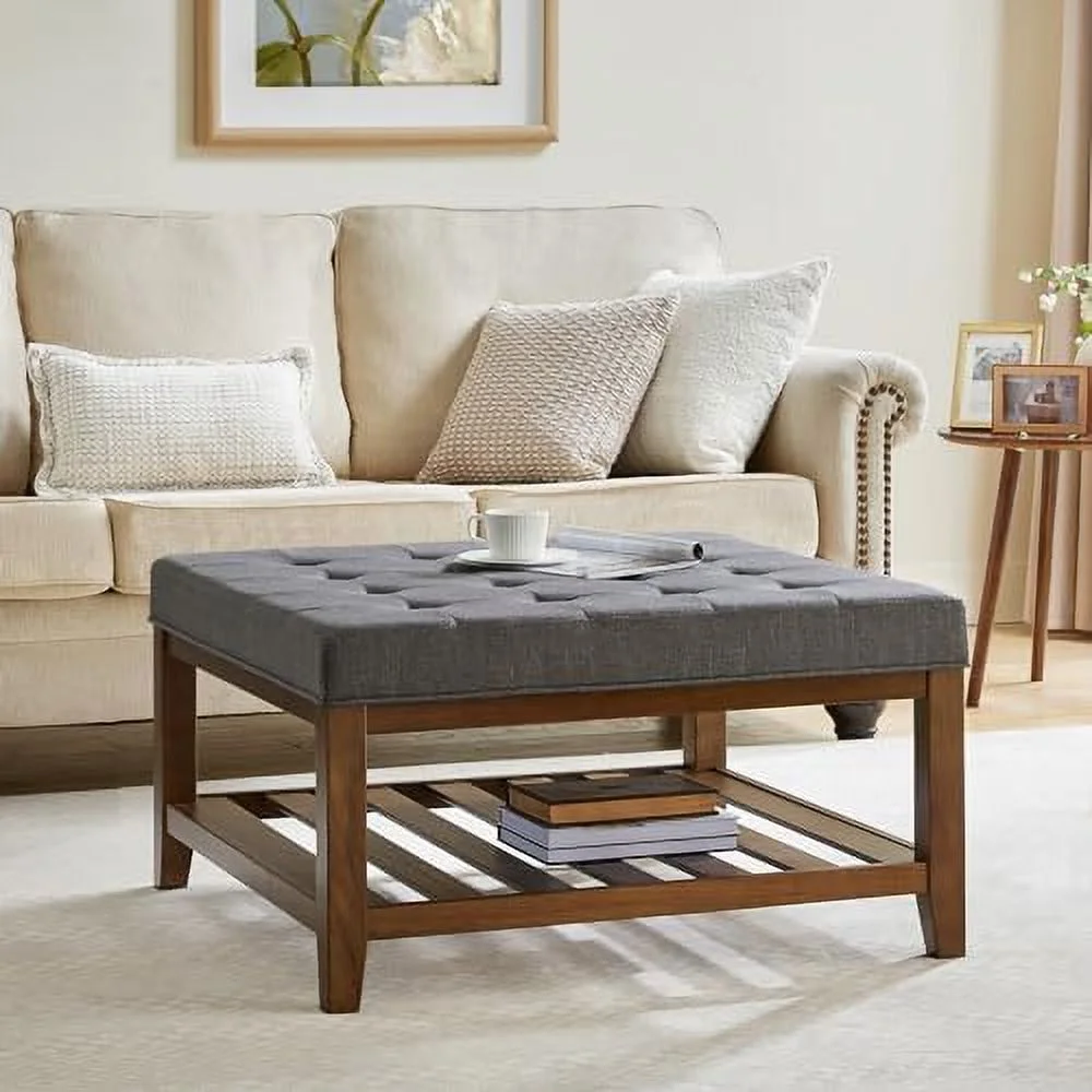 TJUNBOLIFE Square Ottoman Coffee Table with Button Tufted Upholstered Linen Coffee Table for Living Room Farmhouse Mid Century Modern Wooden Stool Footrest Ottoman with Wood Light Be
