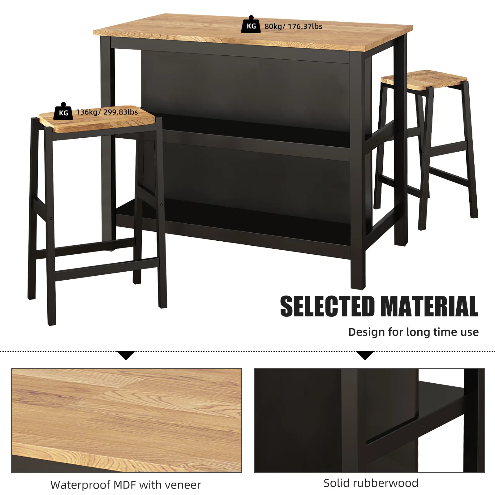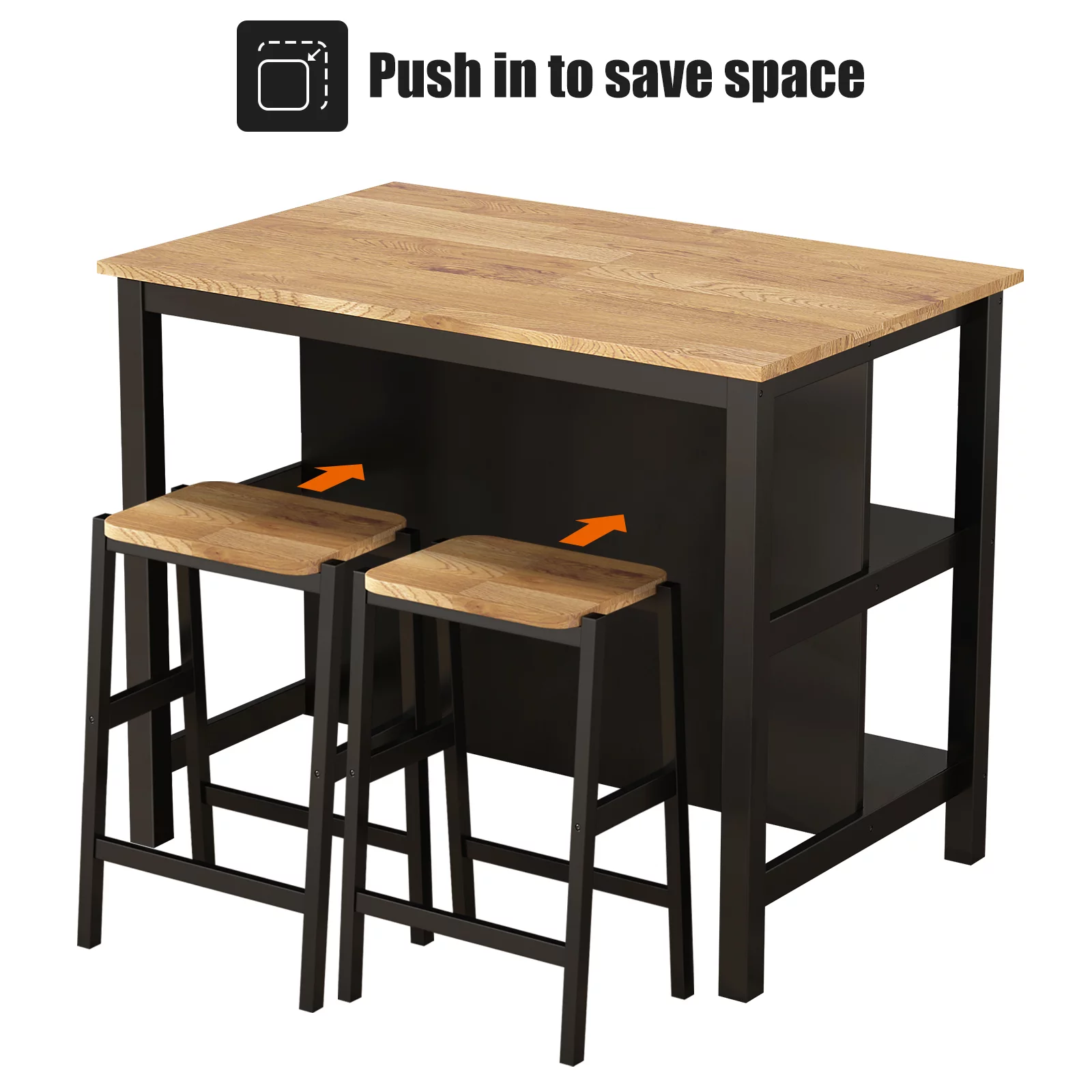 3 PCS Dining Table Set Rustic Retro Breakfast Table Dining Stools RubberWood for 2 with Two Open Shelves for Small Space Kitchen Dining Room