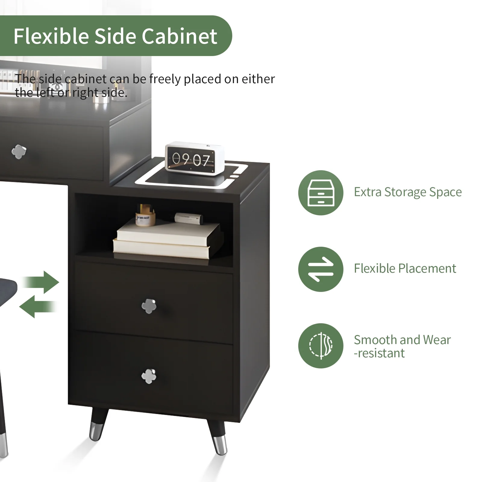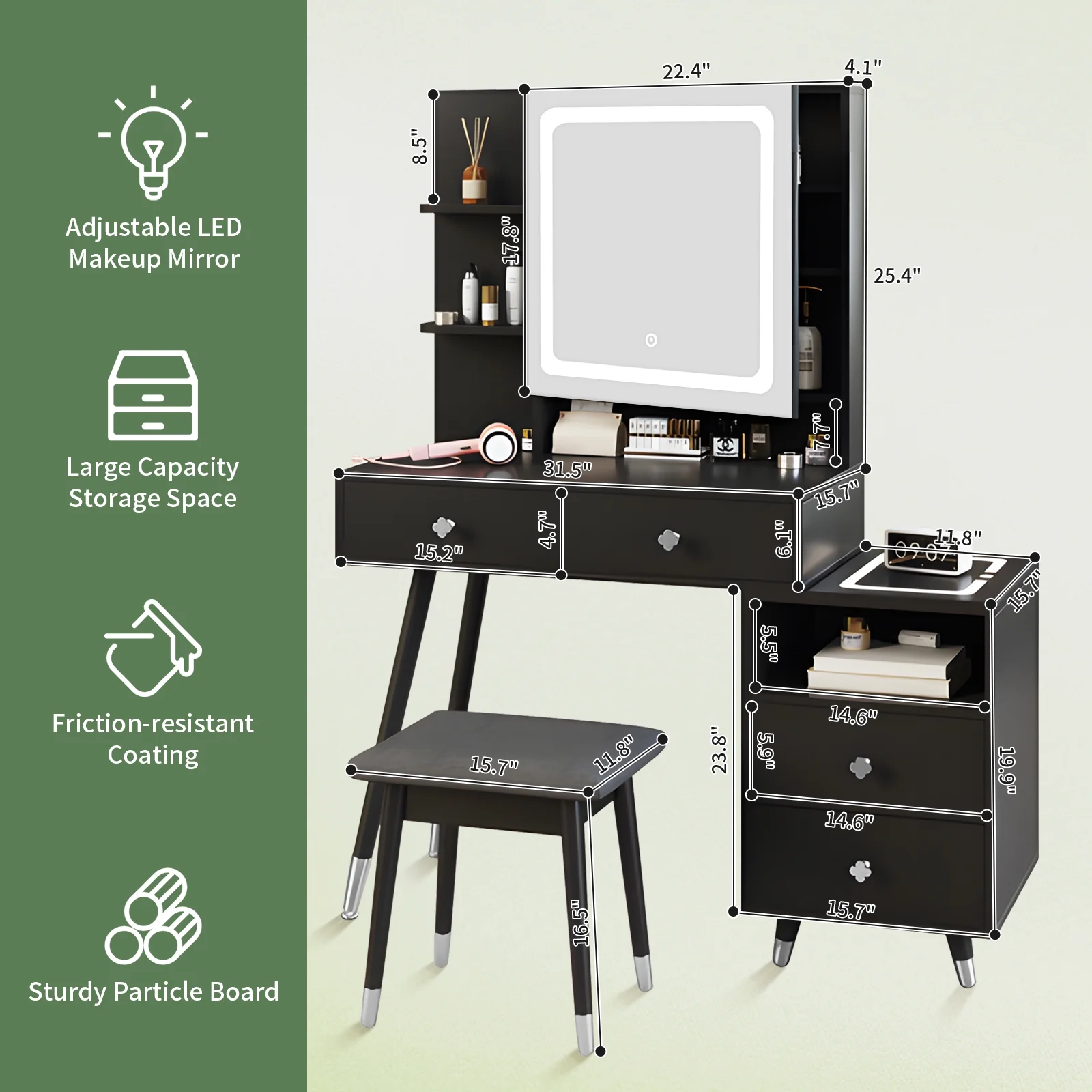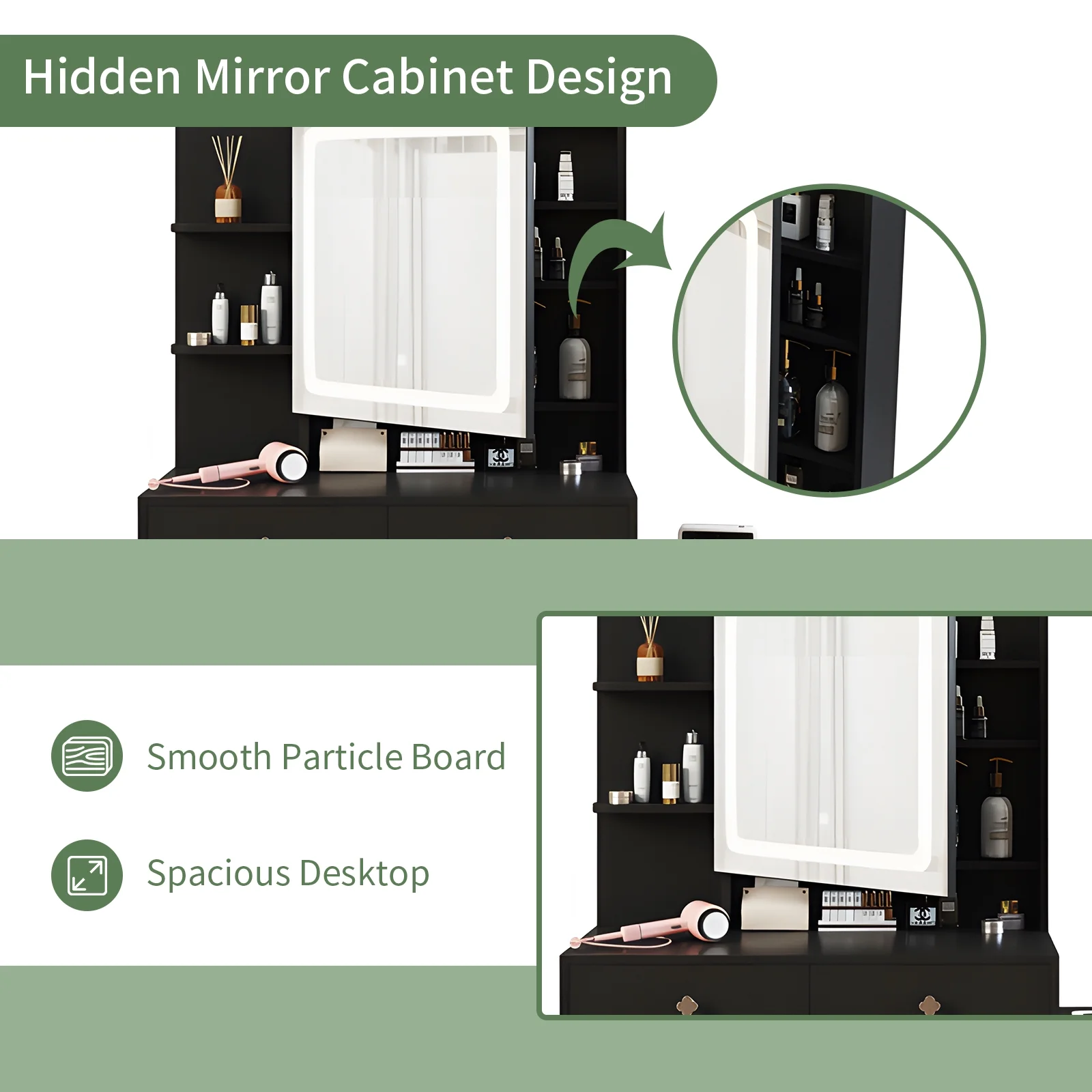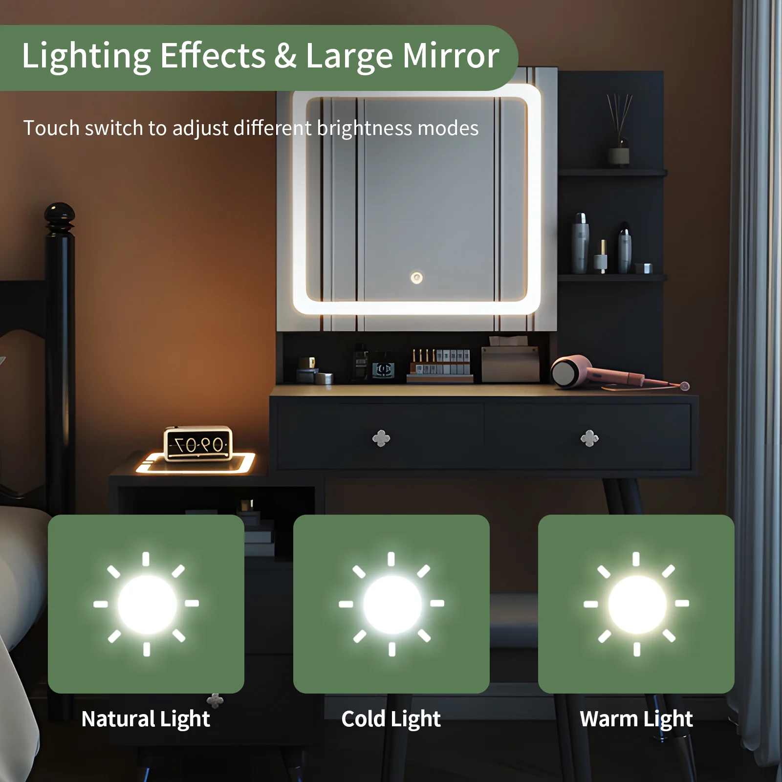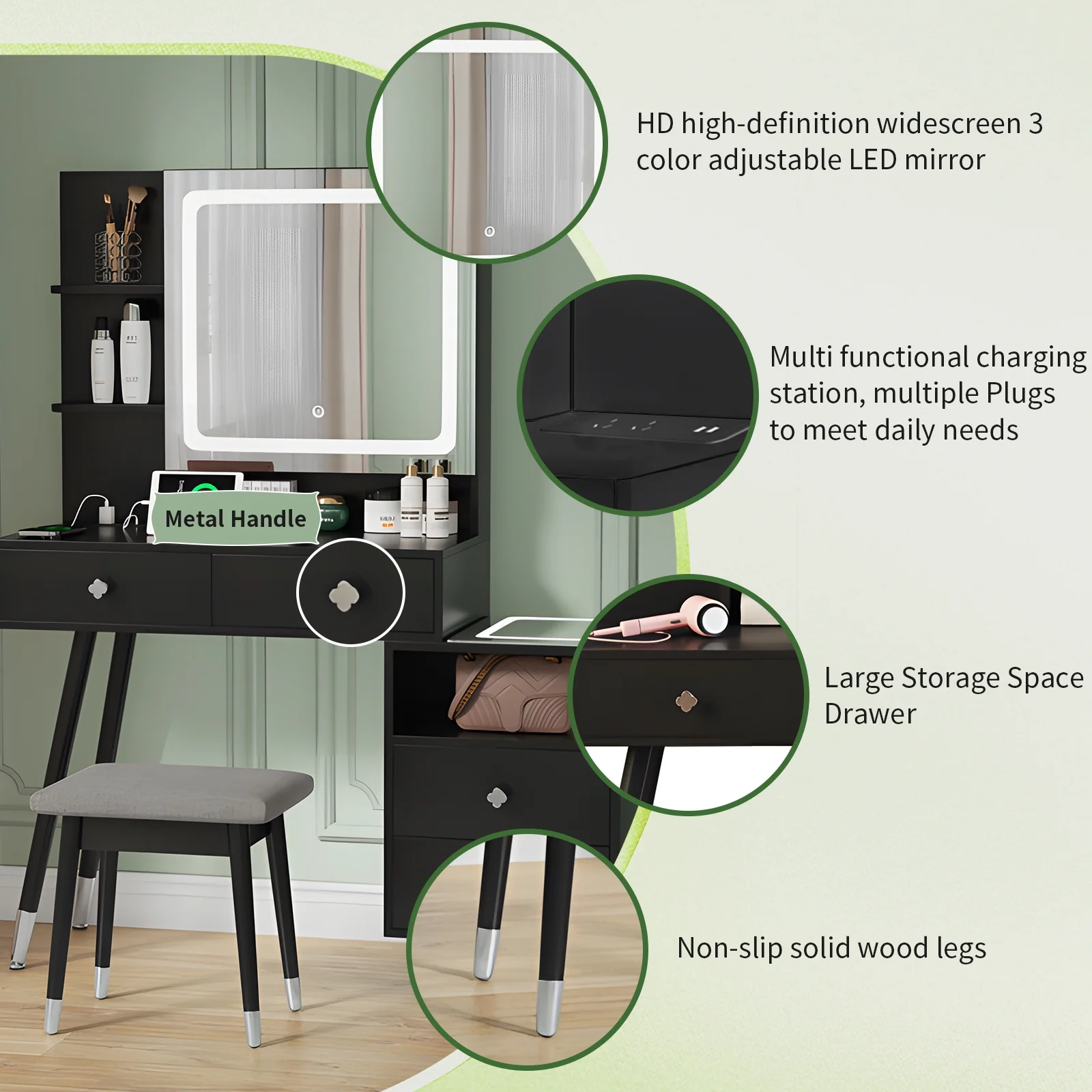 SYTHERS Dressing Table with LED Lighted Mirror, Makeup Desk Vanity Set with Charging Station, 4 Drawers, 2-Layer Shelf, Mirror Cabinet, 3 Color Lighted Mirror, Cushioned Stool, Black