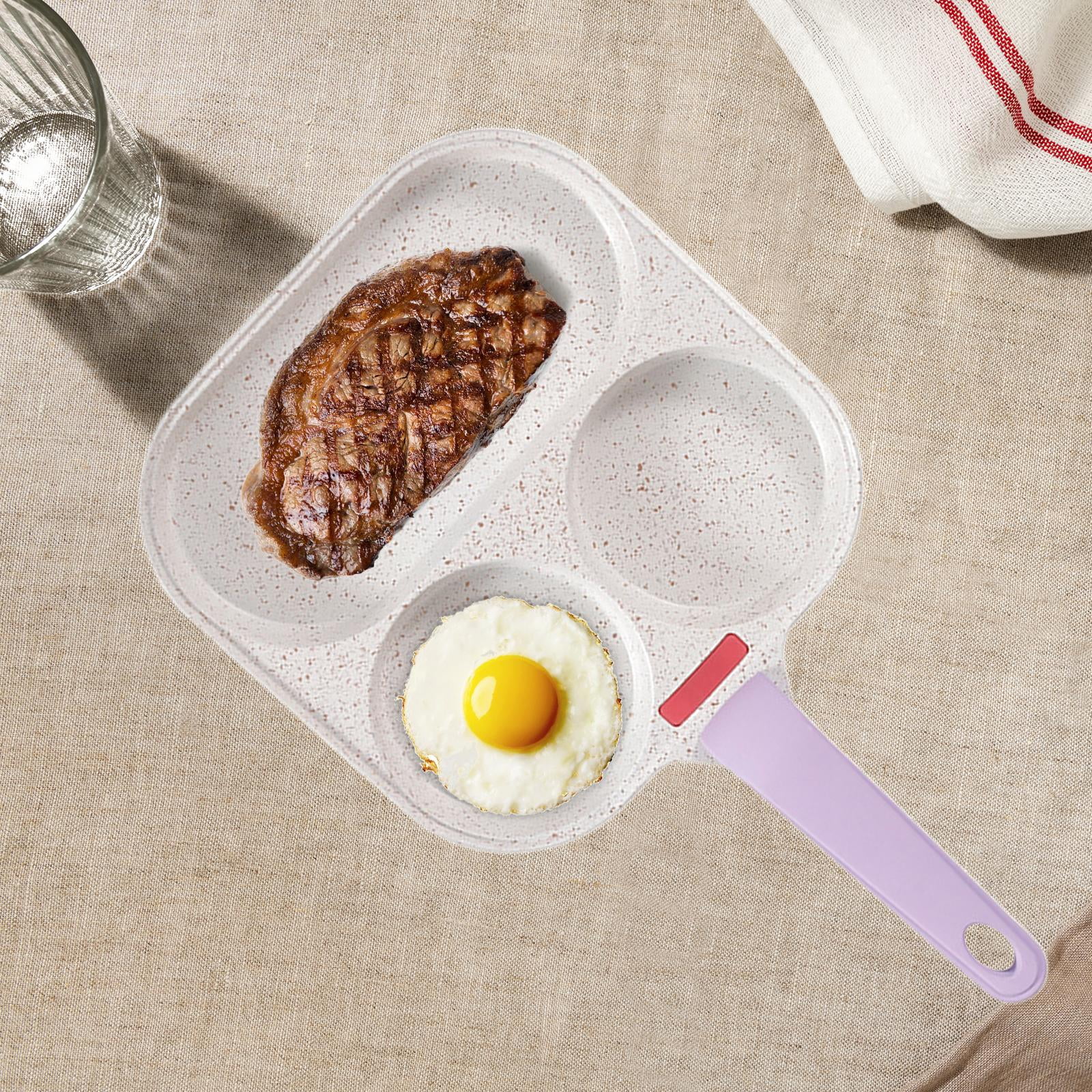 Egg Frying Pan, Divided Grill Frying Pan Egg Cooker Pan Kitchen Cooking Tool 3 in 1 Nonstick Pan, for Baking Frying Cooking Steak Breakfast violet handle