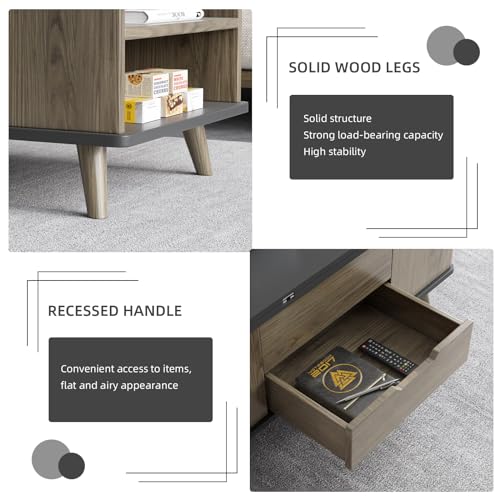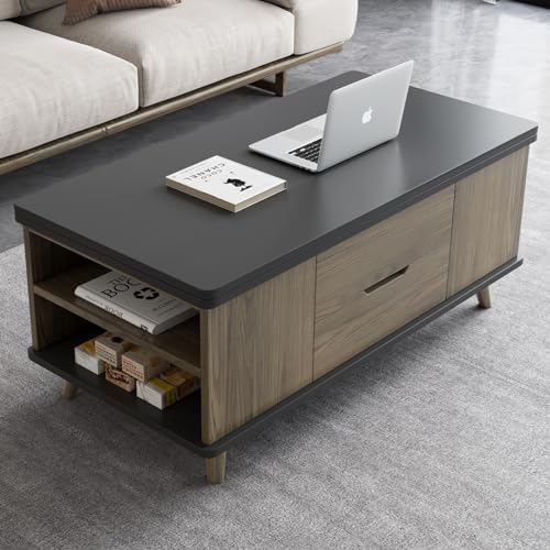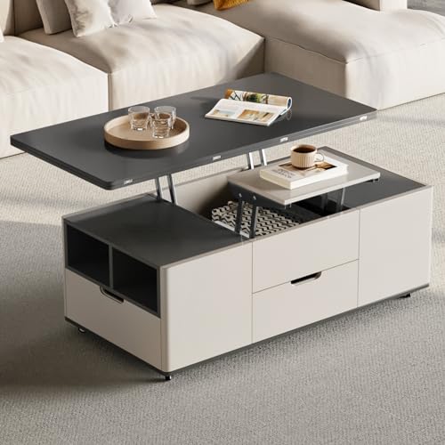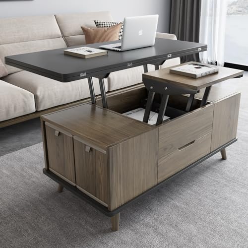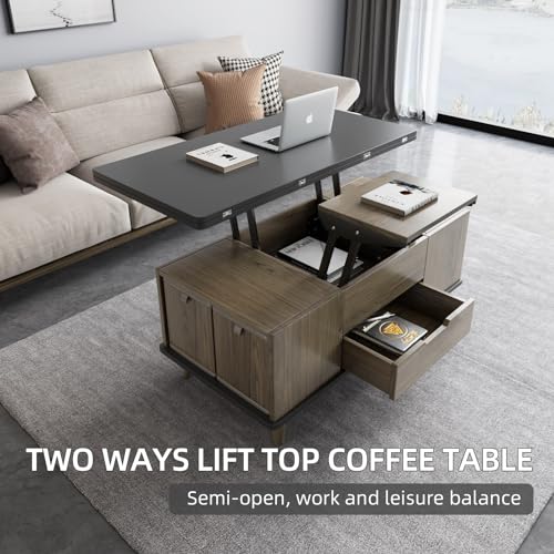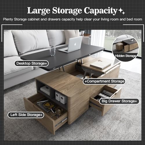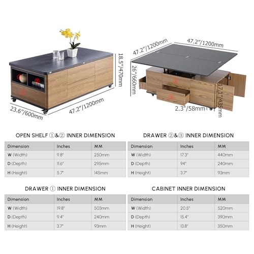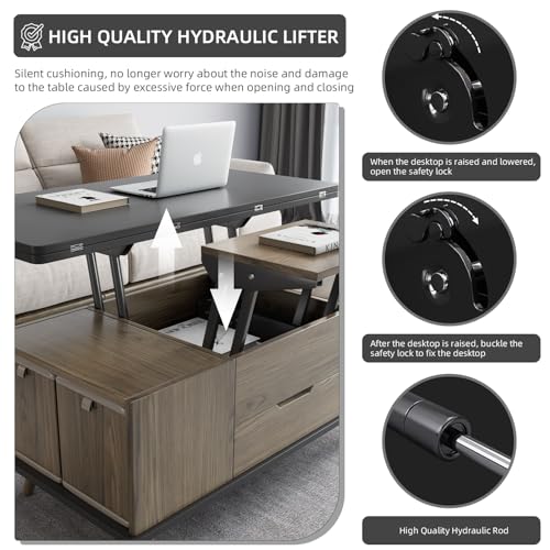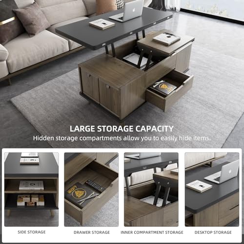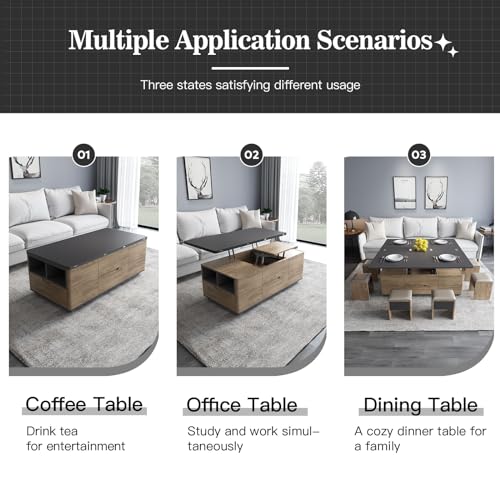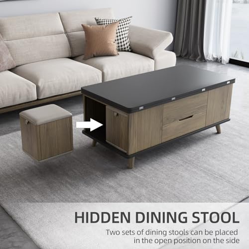 Lift Top Coffee Table with 4 Stools & Hidden Compartment and Storage Shelf, Rising Tabletop Dining Table for Living Room, Farmhouse Extenable Coffee Table,47.24in L,Rustic Brown &Grey