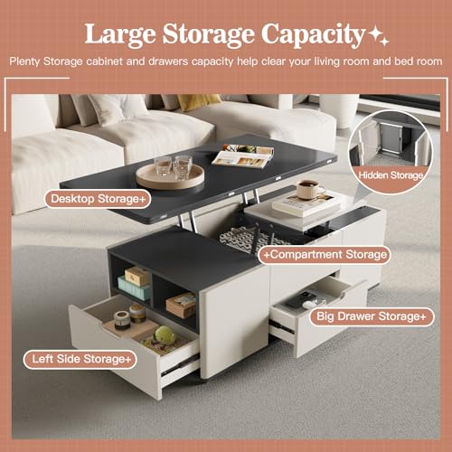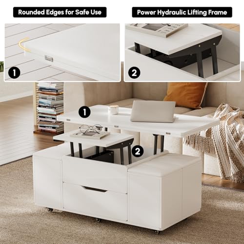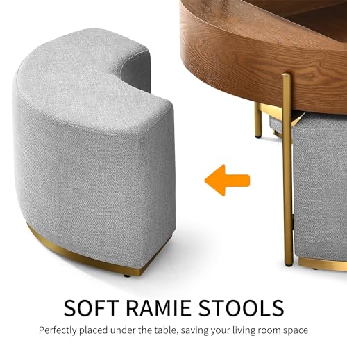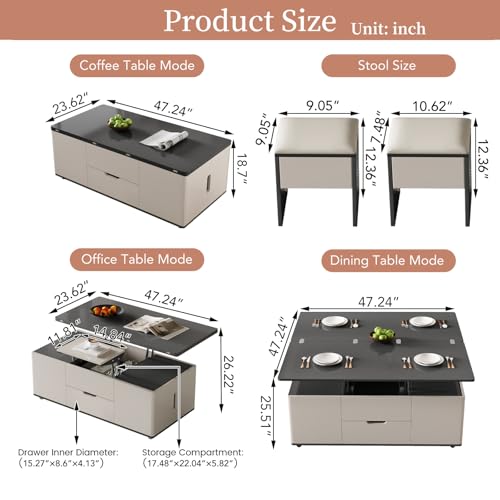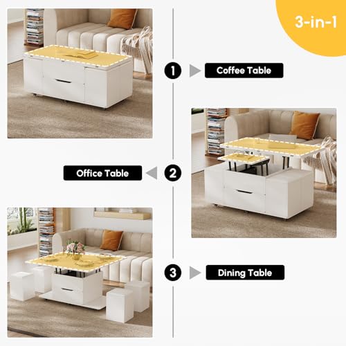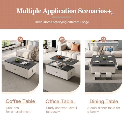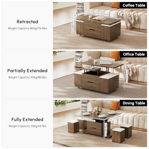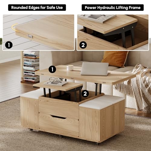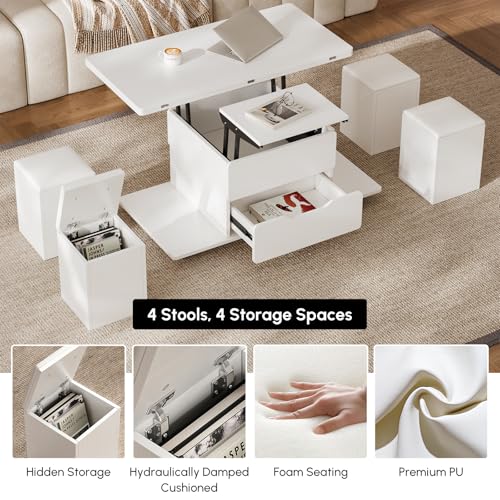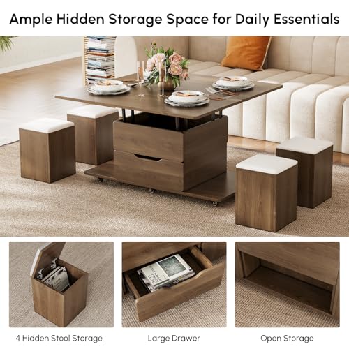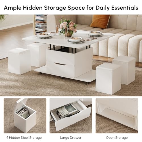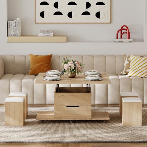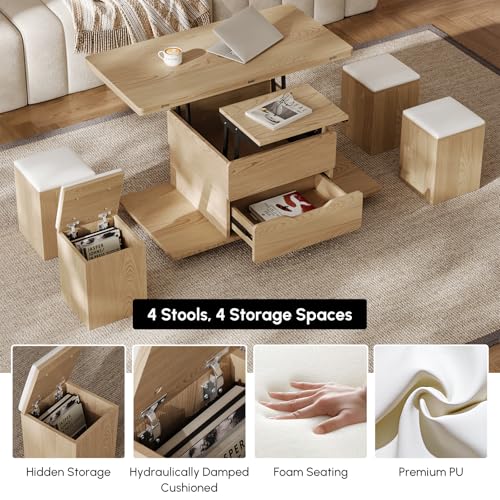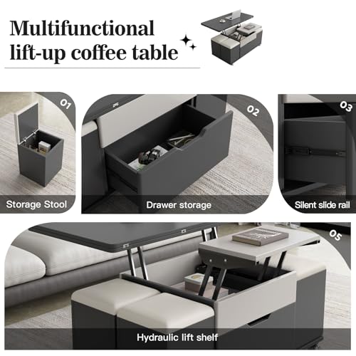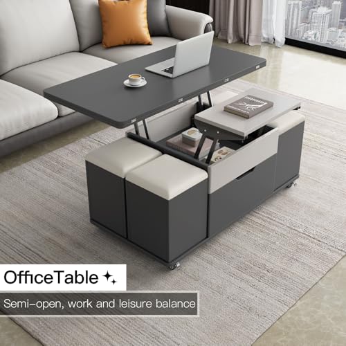 Modern Lifting Coffee Table with 4 Stools,Lift Top Coffee Table with Storage,Multifunctional End Table for Eating Area,Great As Work Or Snack Station