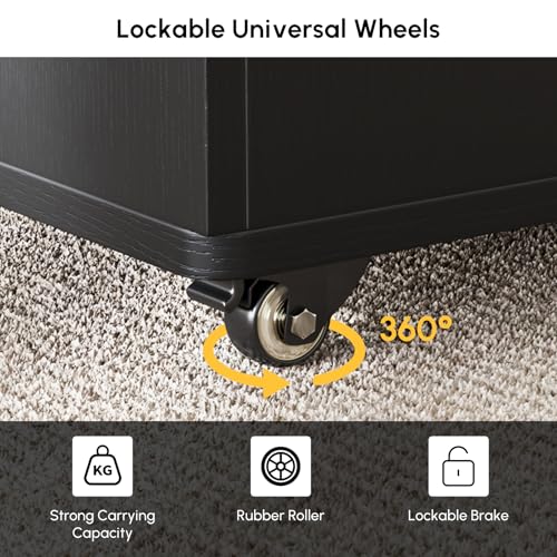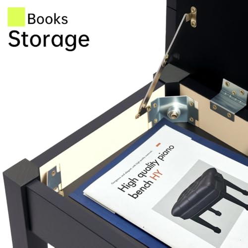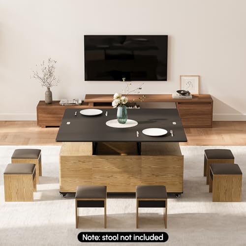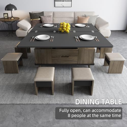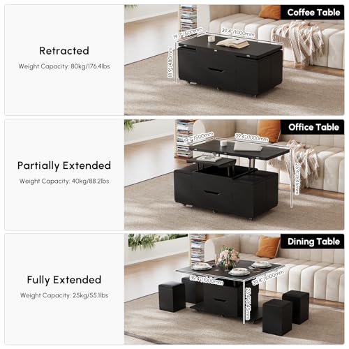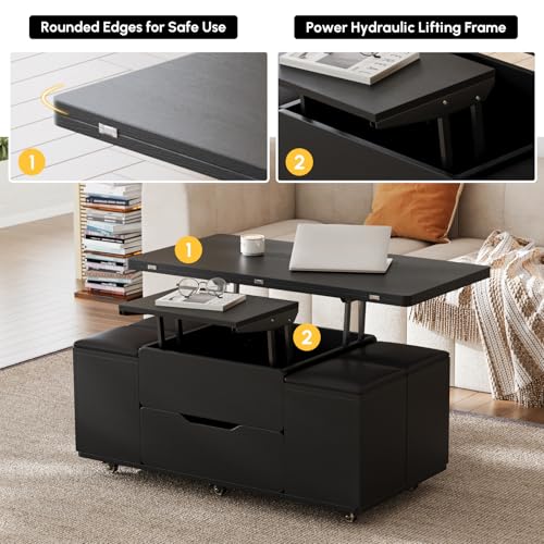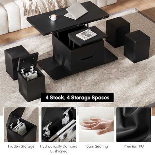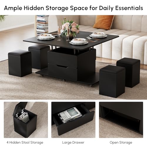 homary Black Lift-Top Coffee Table with Hidden Storage, 3-in-1 Modern Folding Center Table with 4 Stools, Casters, and Lockable Wheels – Convertible Dining & Office Table for Living Room