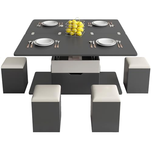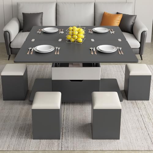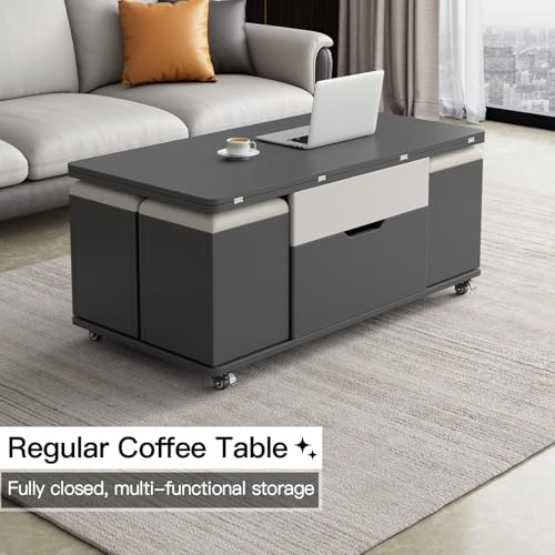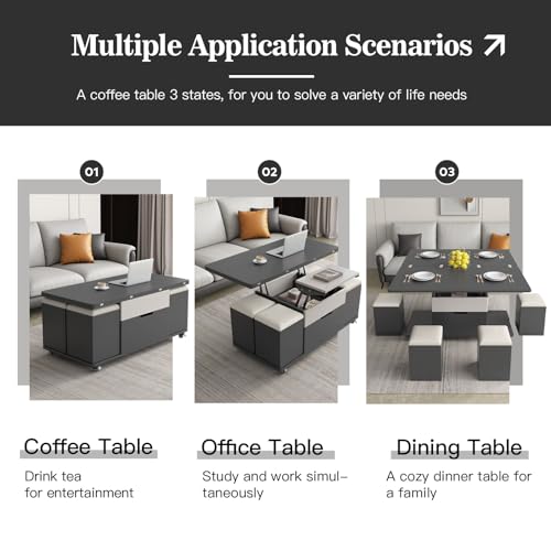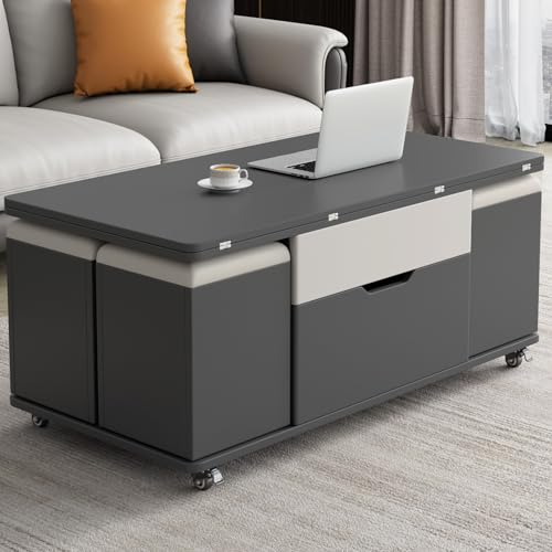 Multifunctional Lift-Top Coffee Table with 4 Stools, 3-in-1 Center Table, Space Saving Folding Dining Table,Lifting Coffee Table for Living Room, Small Space,Grey