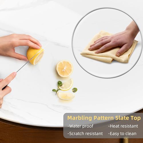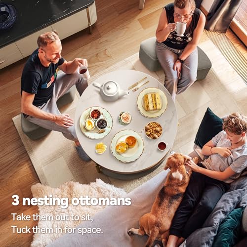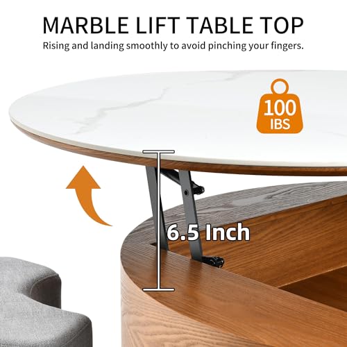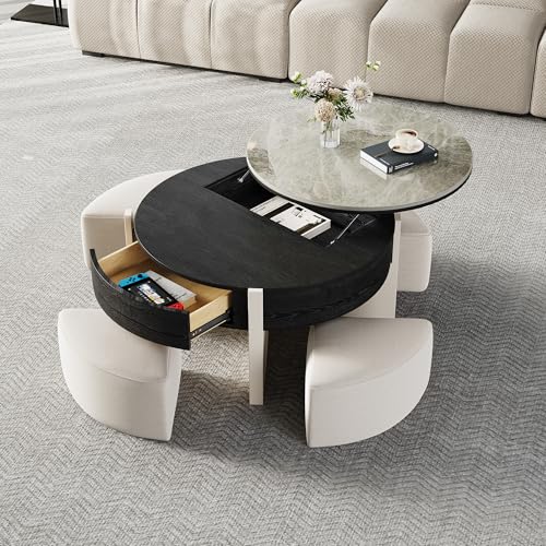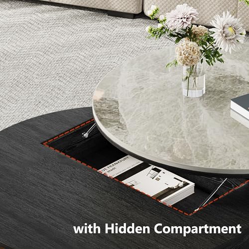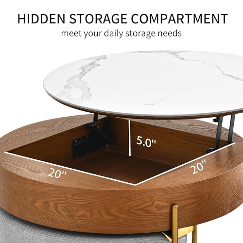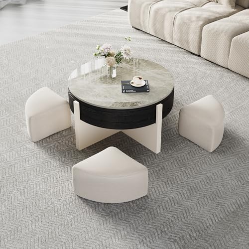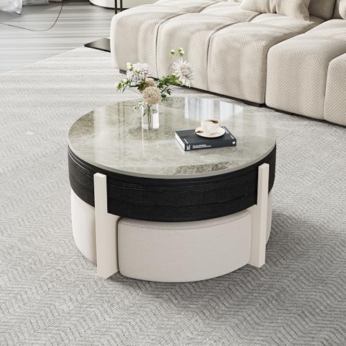 31.5" Modern Round Coffee Table for Living Room, Lift Top Coffee Table with Stools, Sintered Stone Living Room Table with Storage, Fully Assembled Tea Table for Home Office